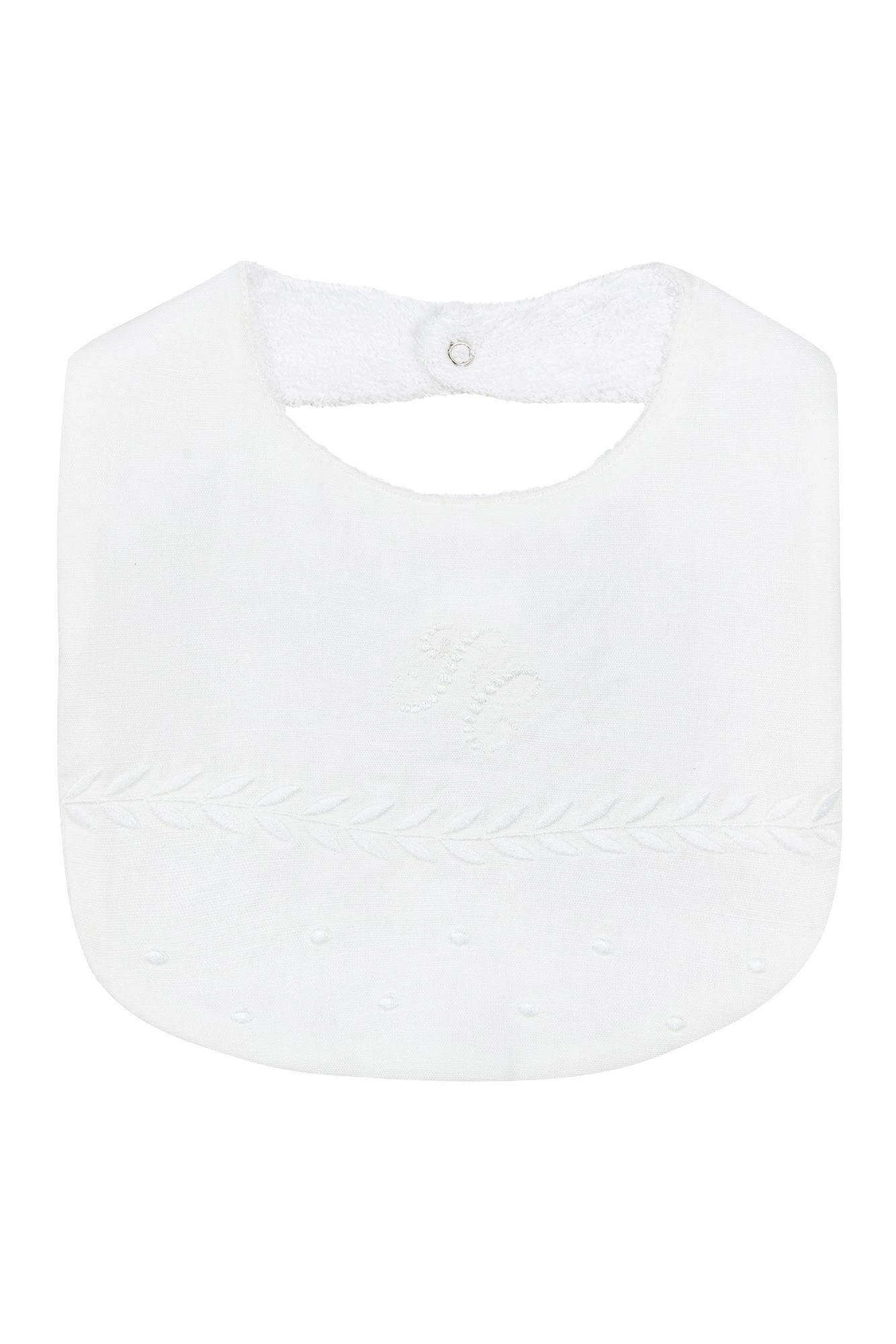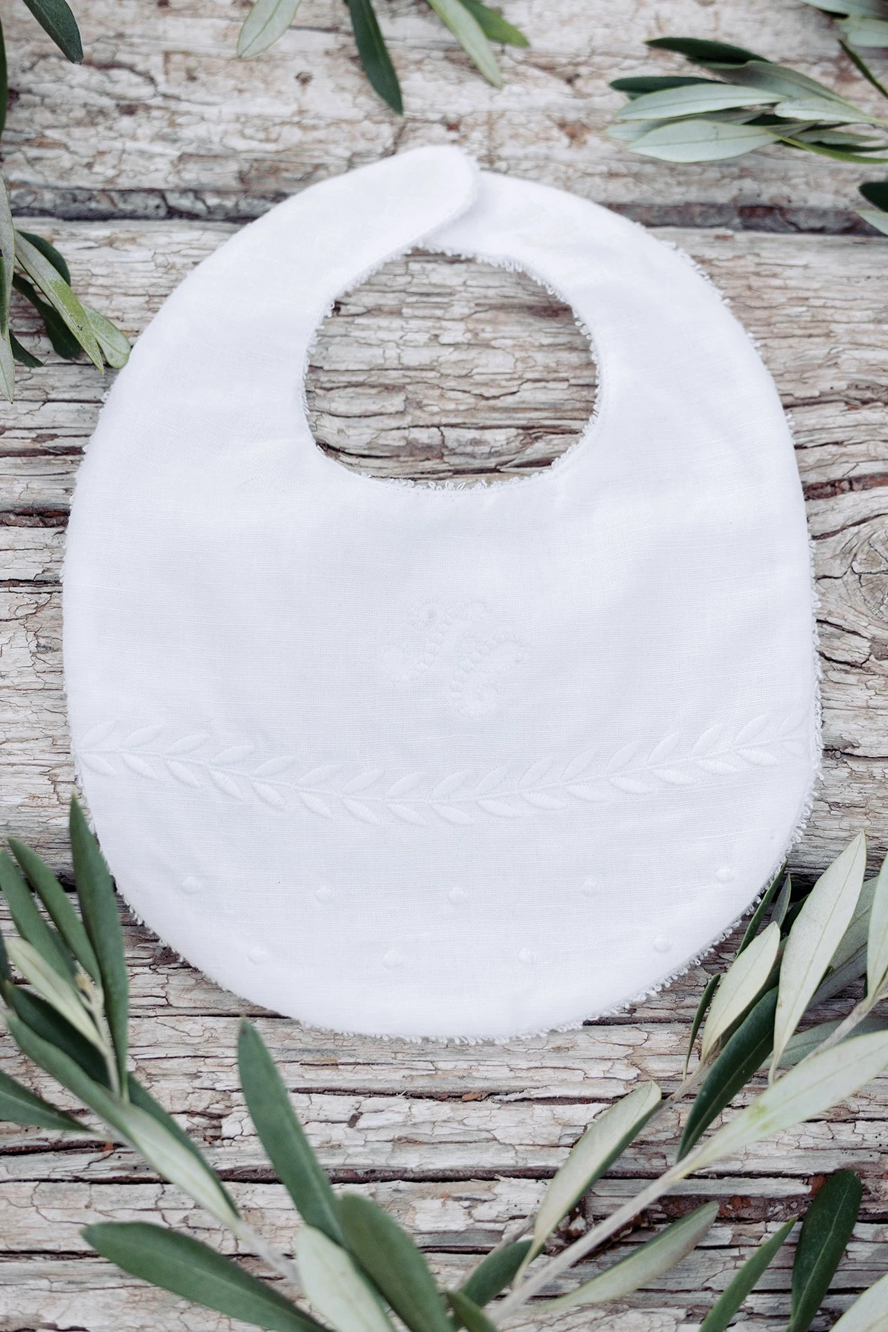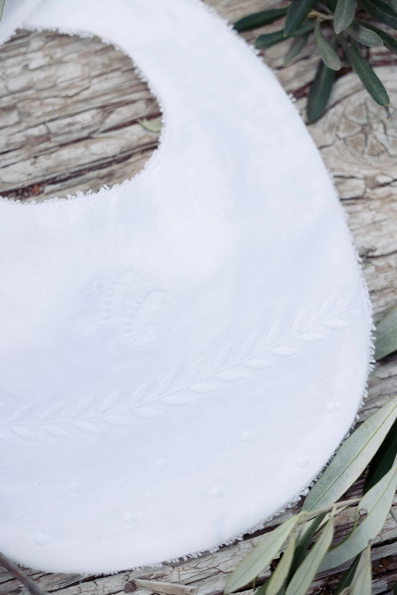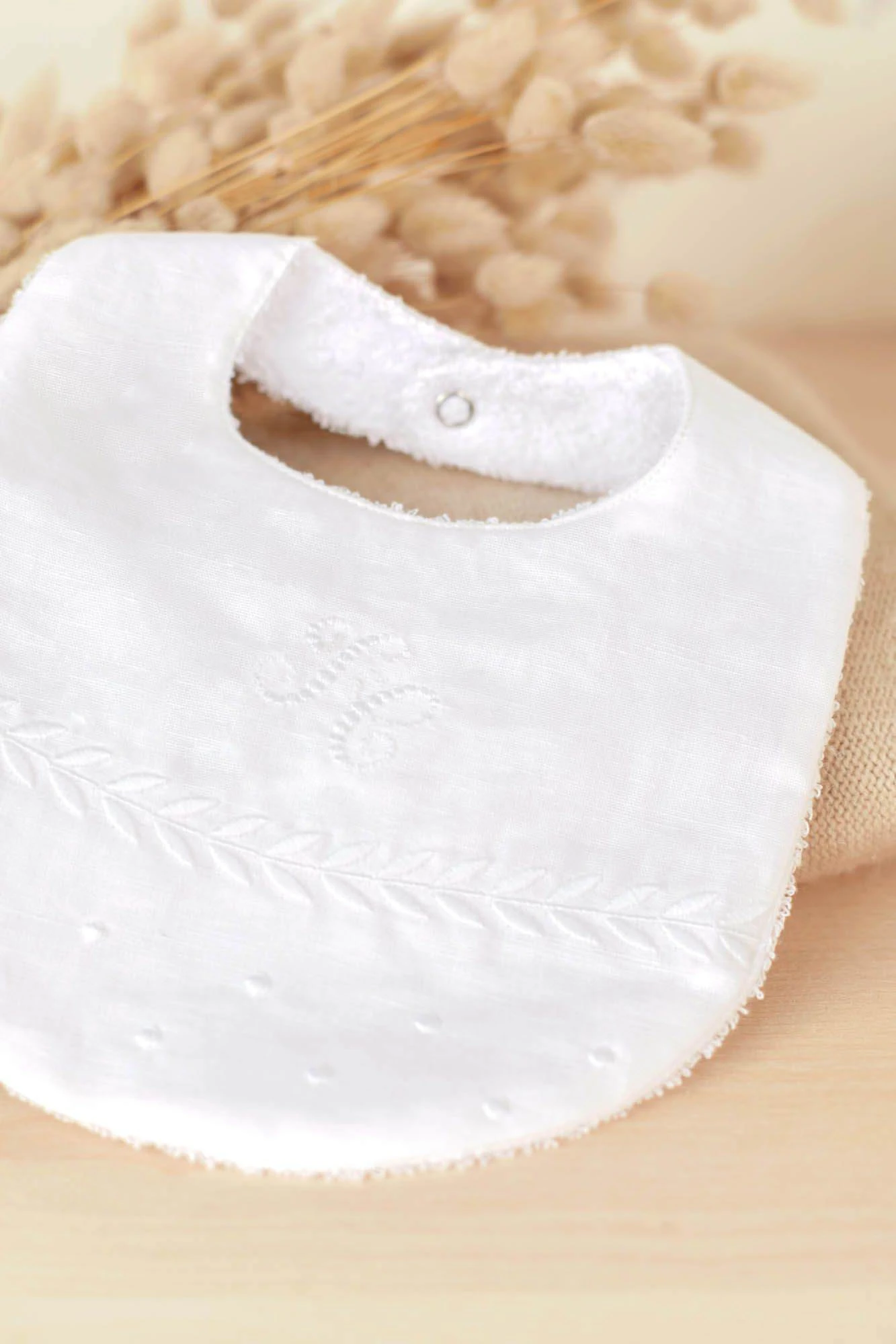 Bavoir lin et coton blanc aux broderies anciennes et délicates ton sur ton. Ce bavoir assure de garder bébé propre grâce à son arrière en matière éponge tout en restant doux et raffiné avec sa partie visible en coton et lin.