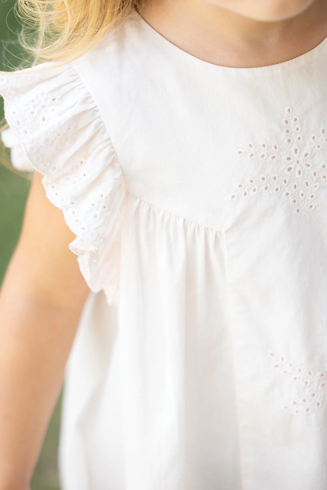 Cette jolie blouse blanche est ornée de magnifiques broderies anglaises à l’avant. On craque sur ses détails volantés ainsi que sur ses manches également brodées apportant une touche d’éclat aux tenues des petites filles. On adore l’associer à un short de la même collection pour un total look.