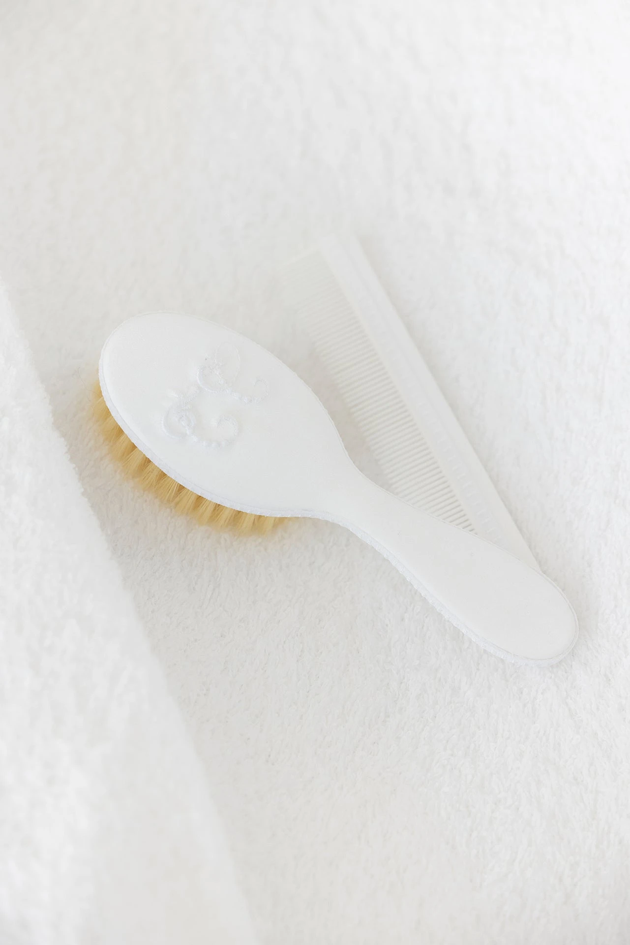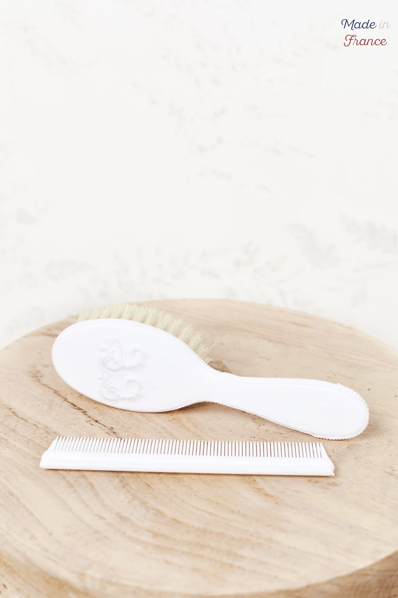Ensemble brosse et peigne Monogramme en tissu blanc, poils en soie. Livré dans une pochette en organza. Dimensions : Brosse : 15 cm ; Peigne : 12 cm. La ligne Monogramme : Discret et chic, cette ligne pour fille ou garçon est un véritable cocon de blancheur. Fabriqué en France. T70052C-01