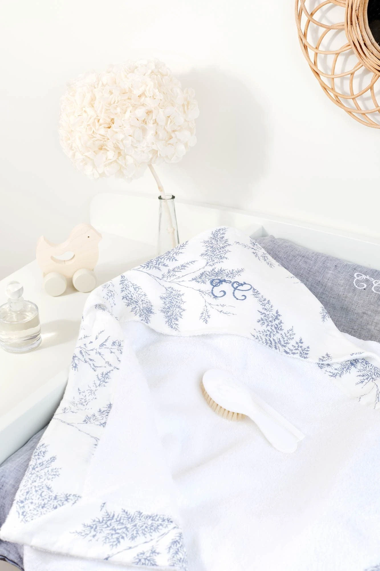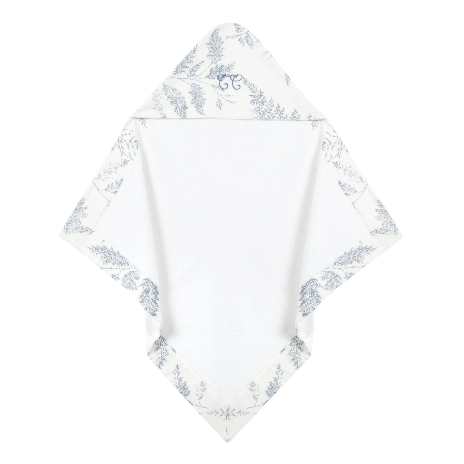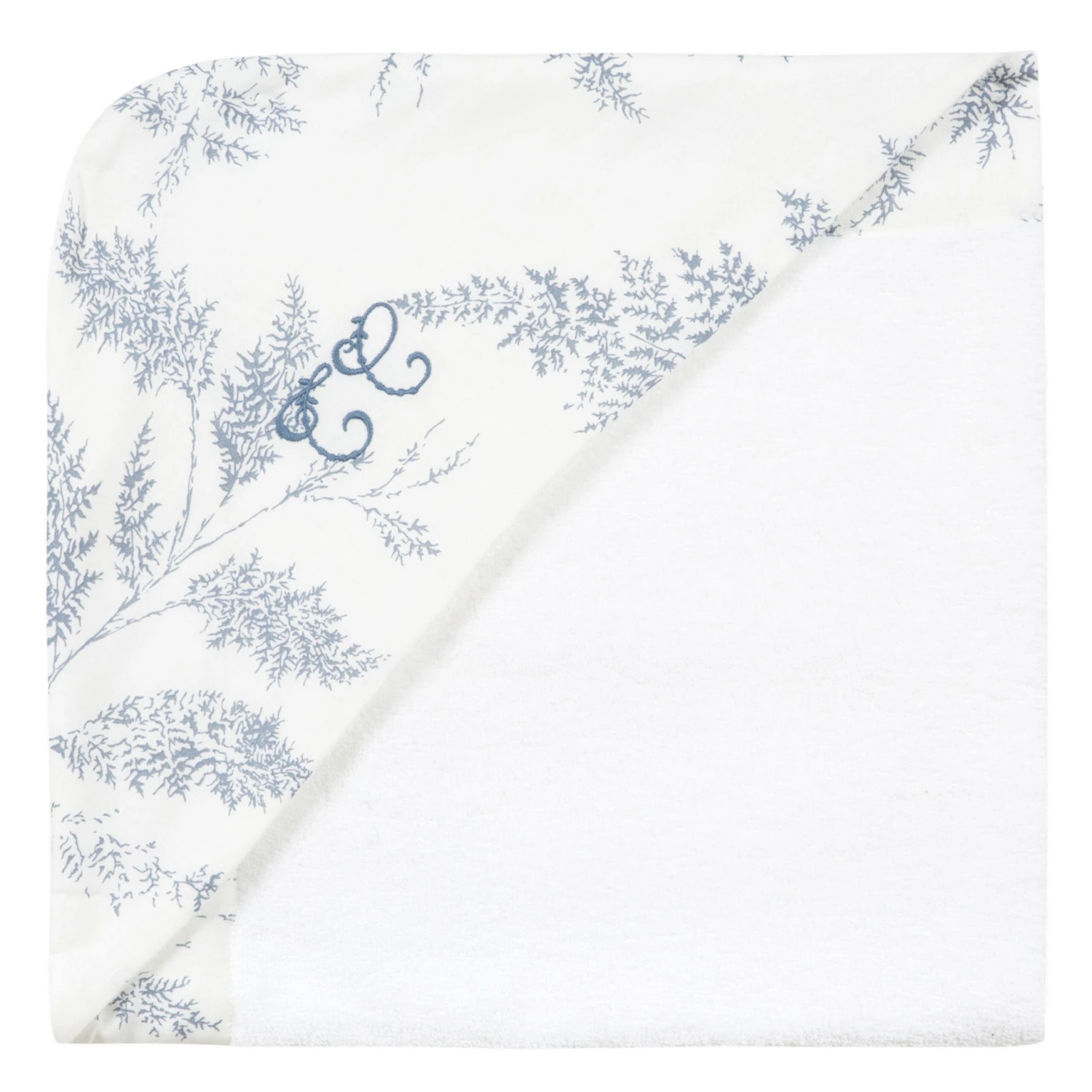 Cape de bain blanche bordée de l’imprimée du thème Feuillage, en coton-lin et éponge. Dimensions : 70 x 70 cm. La ligne Feuillage : une ligne coup de coeur chez Tartine et Chocolat, Feuillage allie l’intemporalité et la sobriété du chambray avec la fraicheur et la modernité de l’imprimé. Fabriqué au Portugal. TQ71001-50
