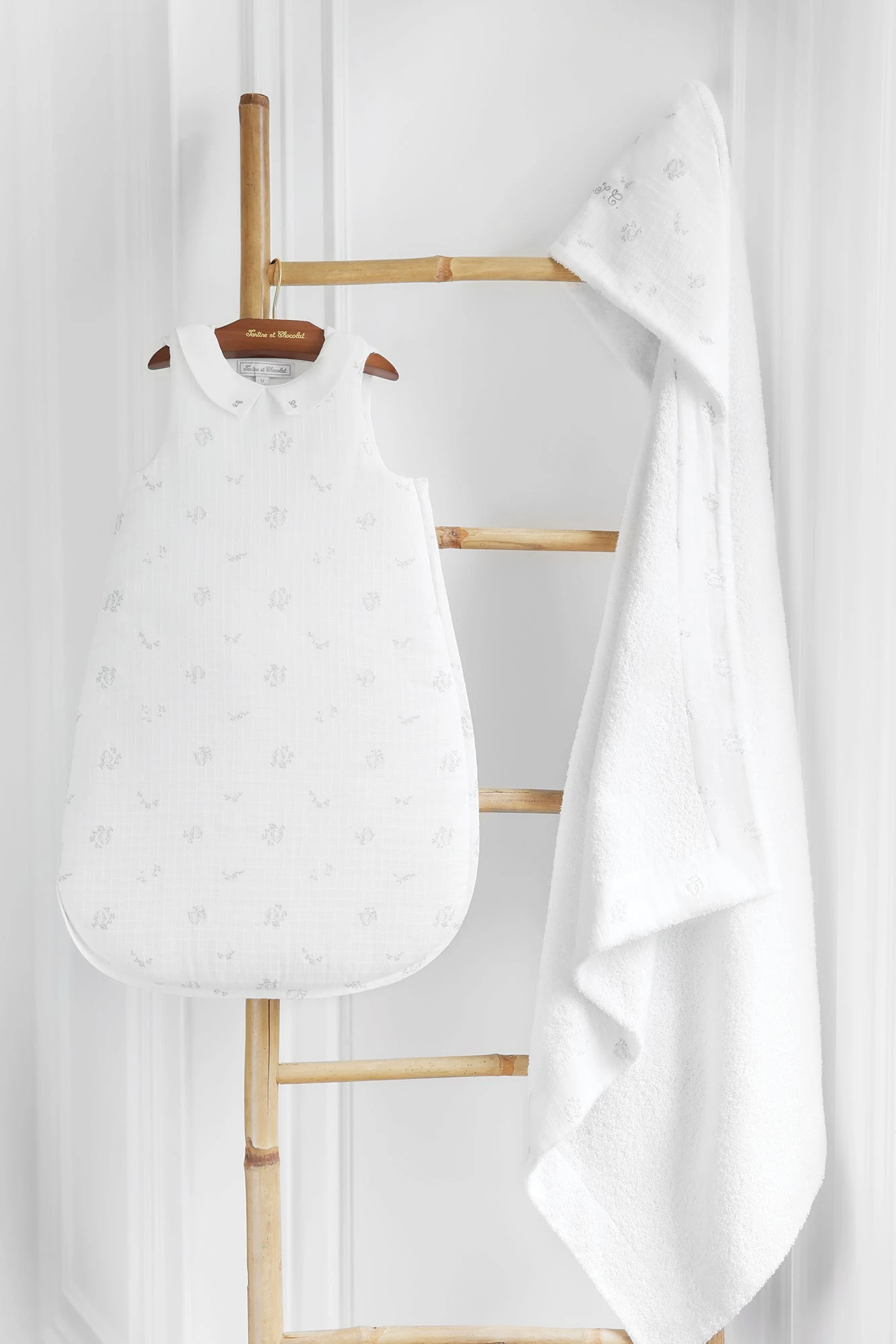 Cape de bain nacre bordée de l’imprimé du thême Petit Augustin, en coton lange et éponge. Enveloppez bébé dans un cocon de douceur avec le lapin iconique de la maison. On craque pour sa matière douce et sa jolie broderie TC. Tartine et Chocolat imagine une nouvelle ligne de puériculture, mixte et délicate.