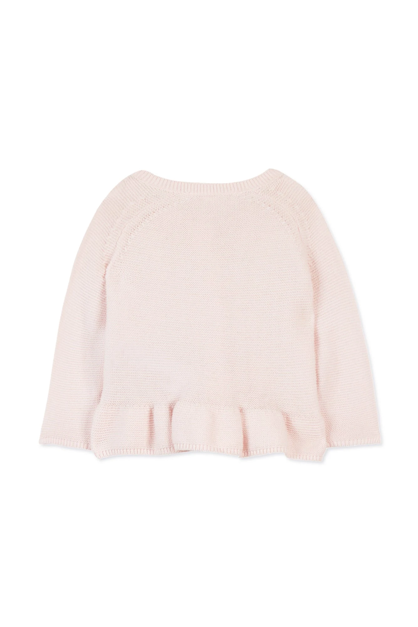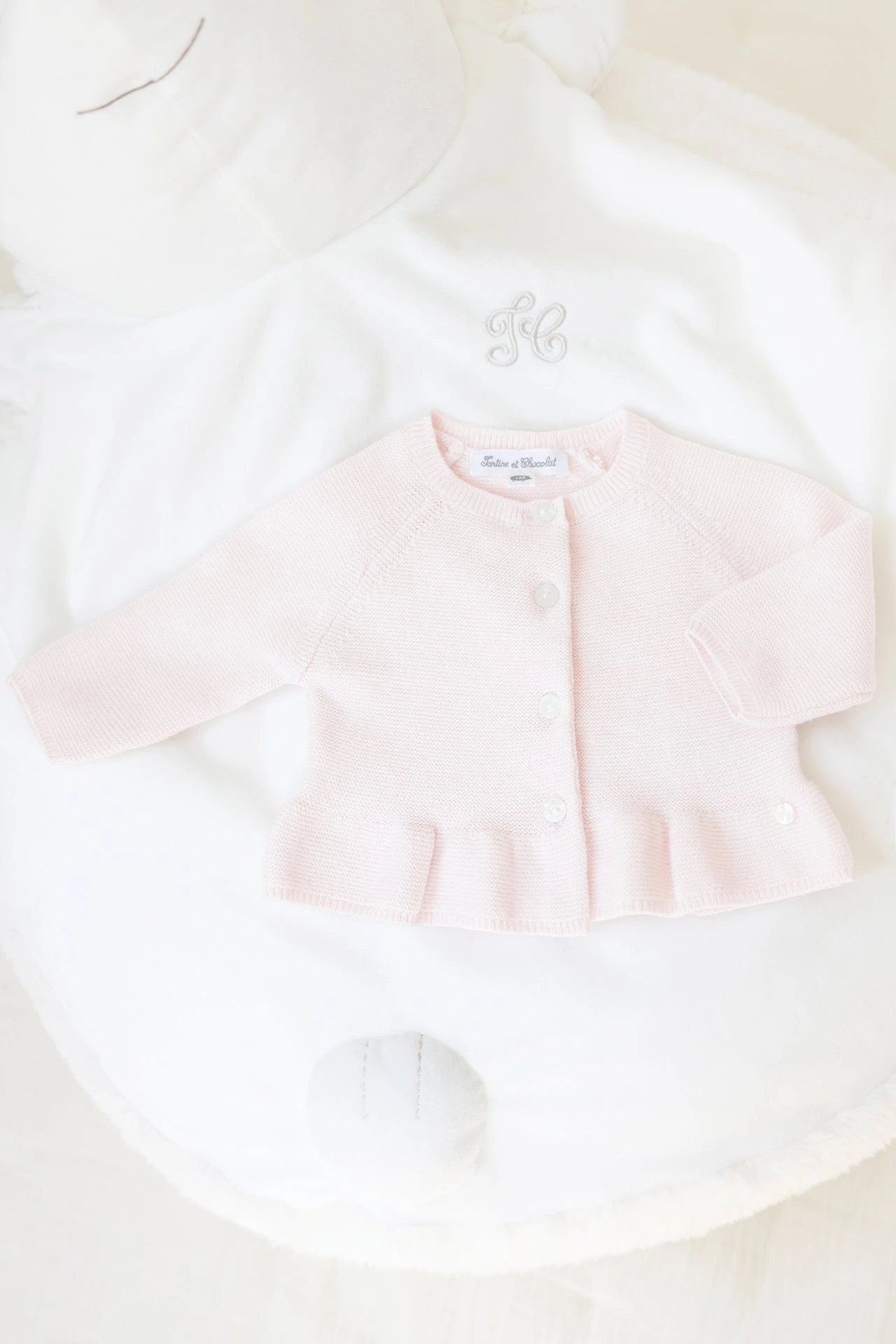 On craque sur ce joli cardigan rose pâle qui sera parfait pour la tenue de bébé en cette saison. Ses délicats volants au niveau du bas ainsi que sa maille point mousse apportent une touche supplémentaire d’élégance à cette pièce. Réalisée en 100% coton, bébé sera blottie dans une bulle de douceur tout au long de la journée. On se plaît à l’associer à une jolie combinaison de la même collection pour un total look.