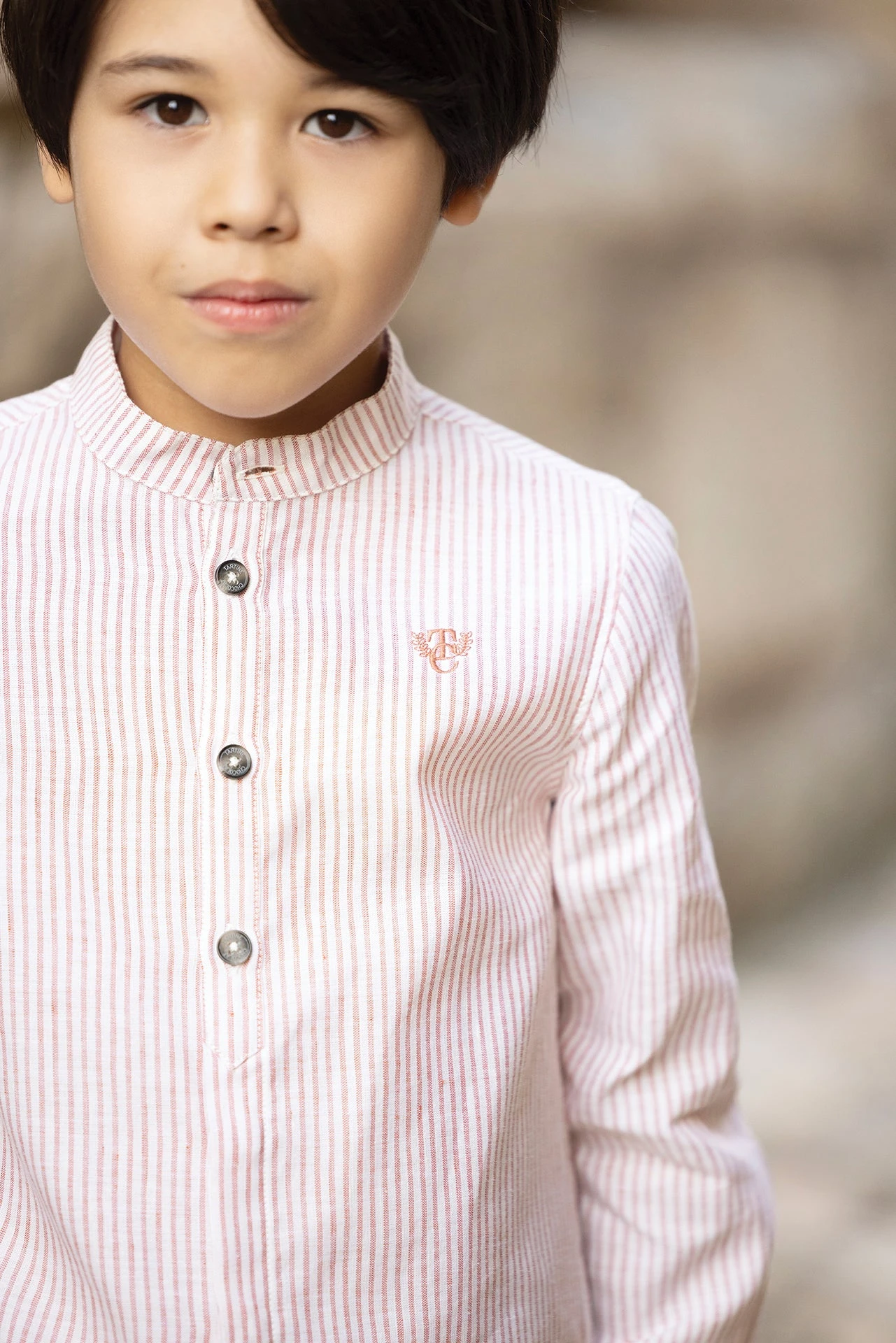 On craque sur cette chemise marron aux rayures parfaite pour cette saison. Confectionnée en coton et lin, cette pièce sera très confortable pour votre petit garçon. Sa coupe apporte une touche supplémentaire d’élégance à la tenue. On se plait à l’associer à un short de la même collection pour un total look.