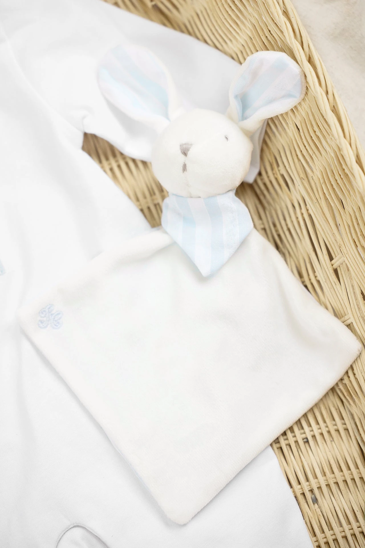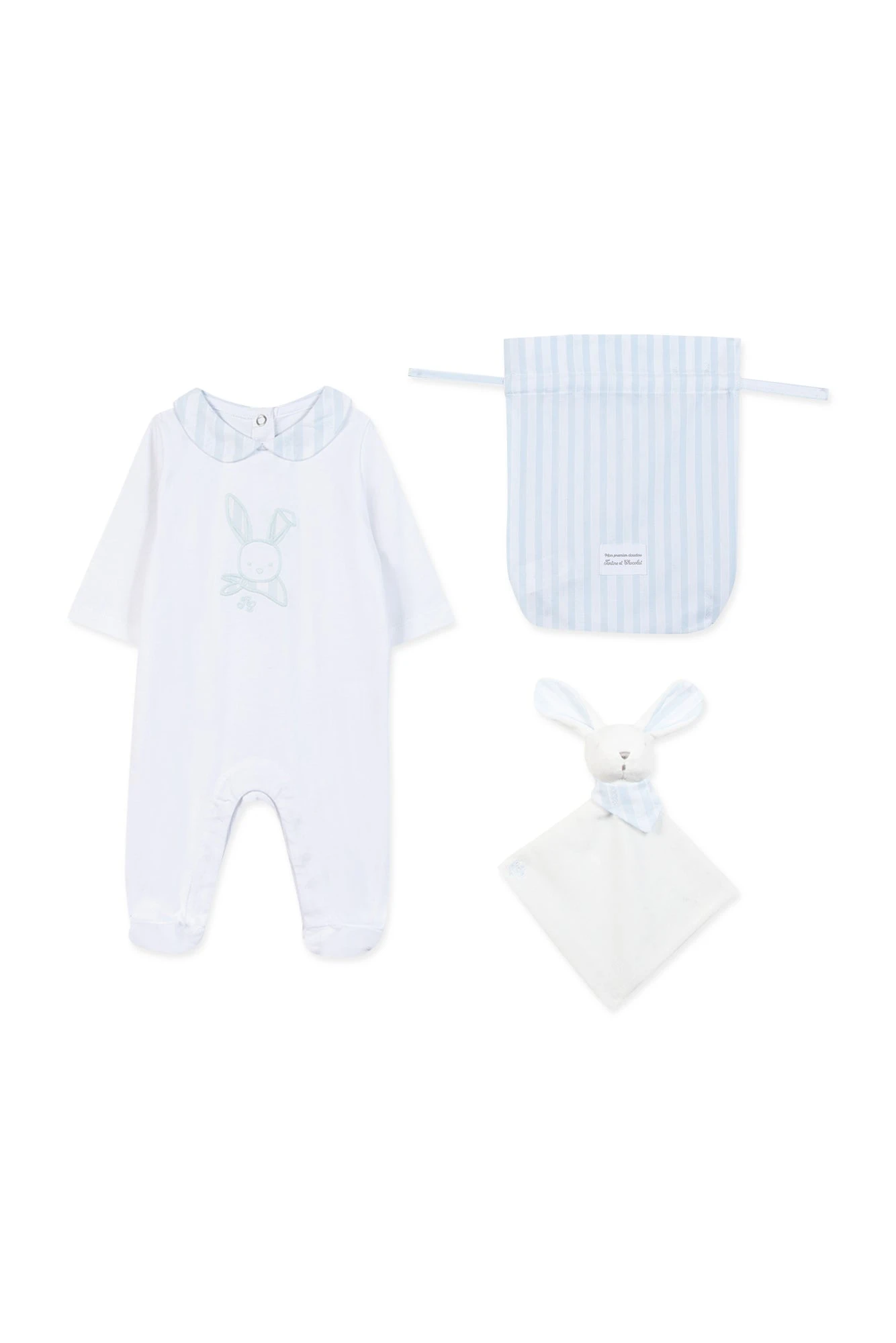 Ce coffret est le cadeau parfait pour la naissance de bébé. On craque pour l’entièreté des pièces que comporte ce coffret : l’adorable pyjama au col rond, le doudou lapin ainsi que sa housse, le tout avec des détails de rayures garda rose pâle iconique chez Tartine et Chocolat. L’illustration lapin apporte une touche supplémentaire de douceur et de tendresse à ces pièces. Réalisé en 100% coton, bébé sera plongé dans une parenthèse de douceur lui offrant des nuits paisibles. Facile à enfiler grâce son système de bouton-pression, le change sera d’autant plus facilité. On se plaît à l’associer à un joli body ainsi que des adorables chaussons de la même collection afin de compléter le look.
