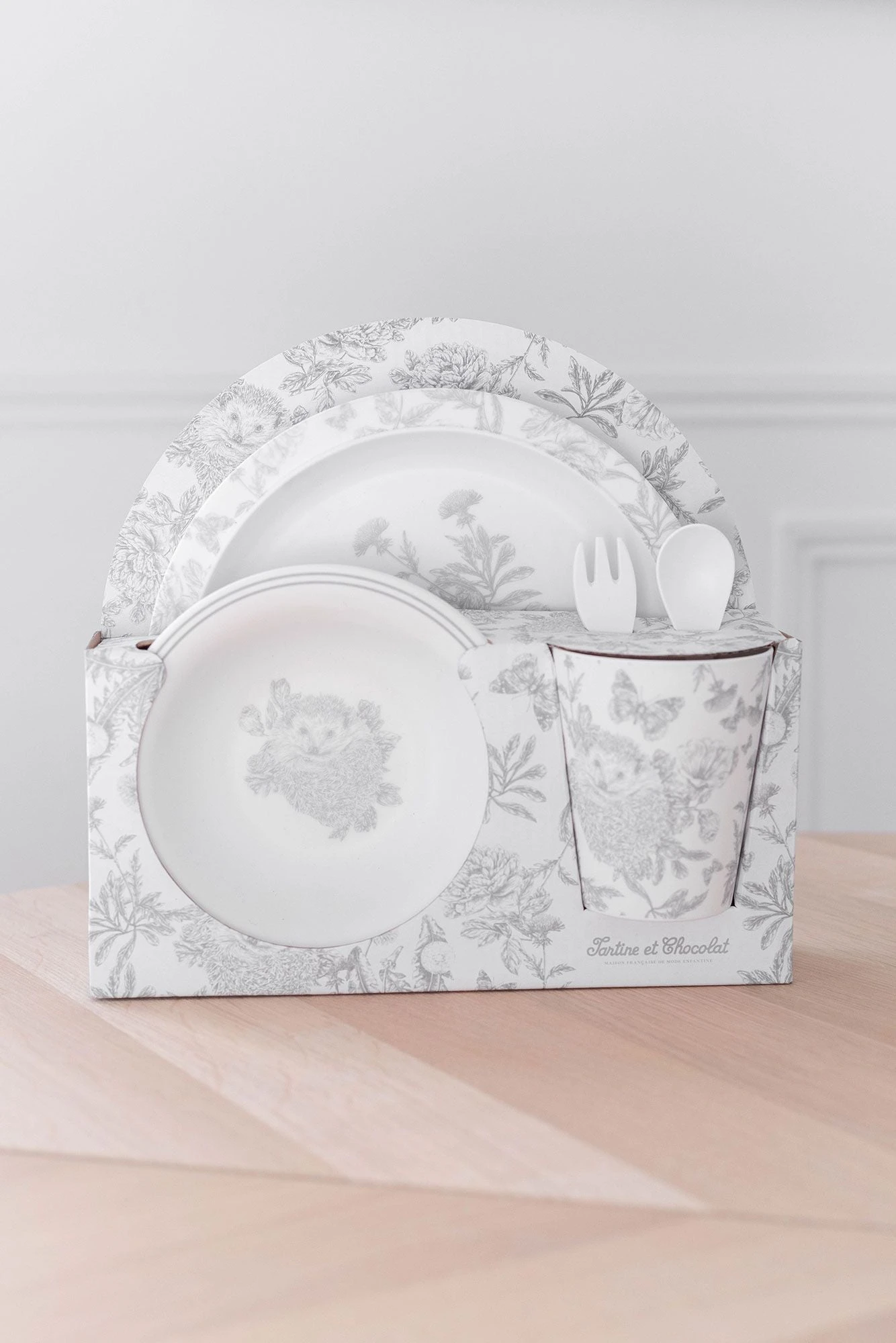 Ce coffret contient : Une grande assiette, une petite assiette, un gobelet, une fourchette, une cuillère.