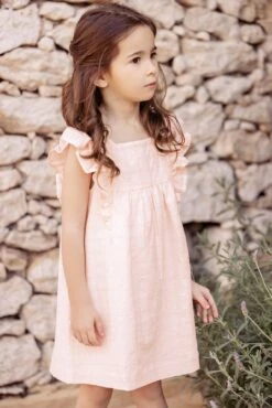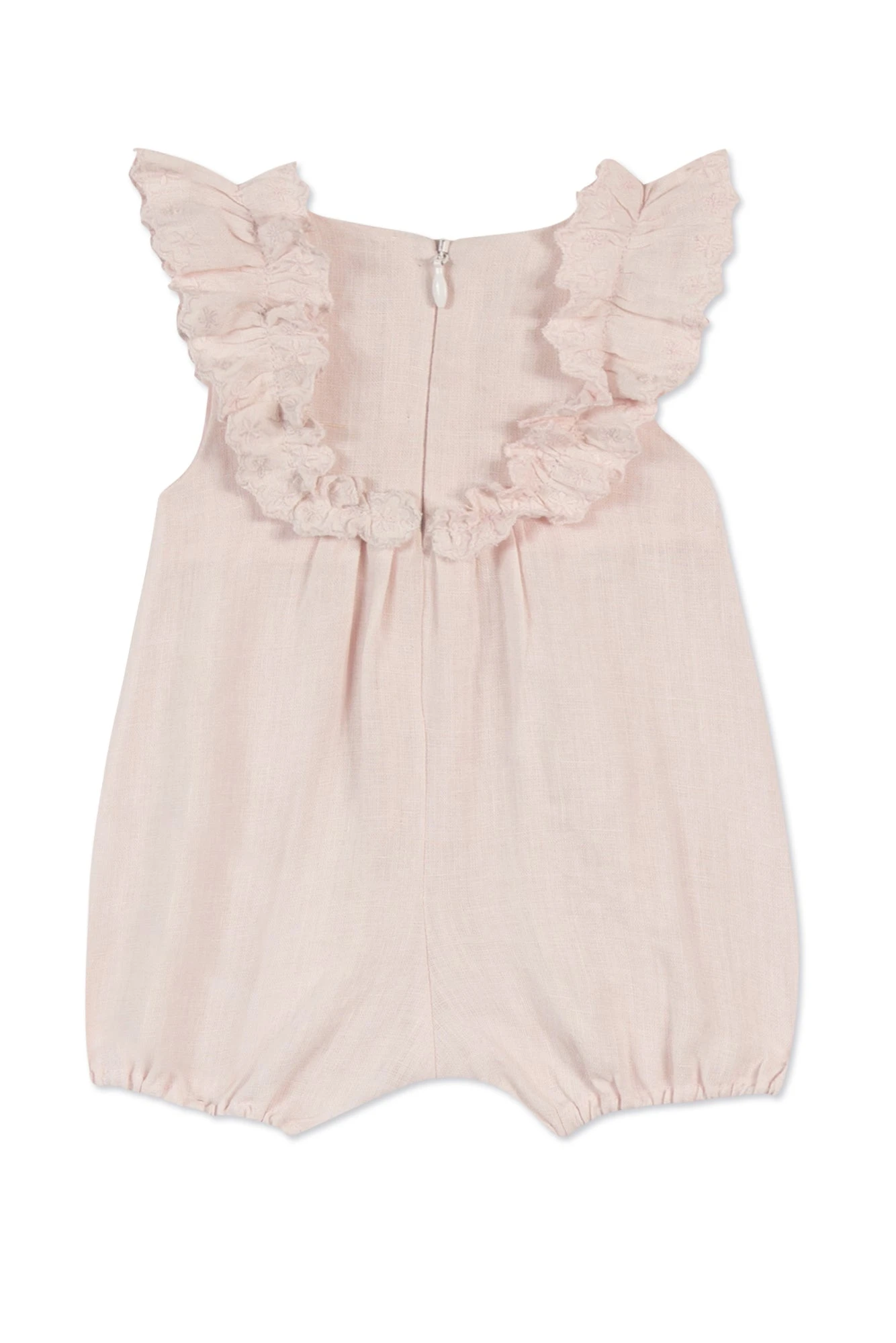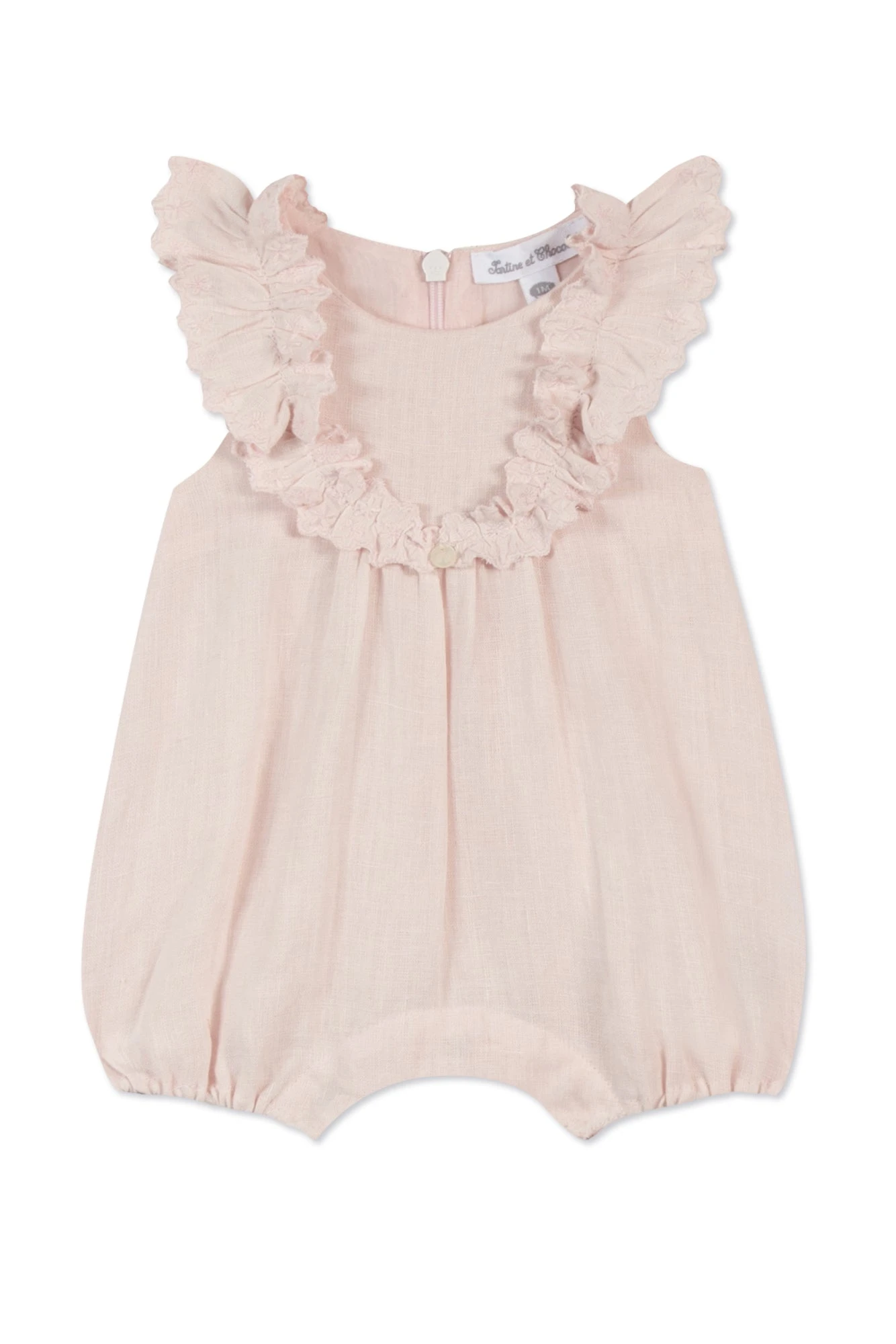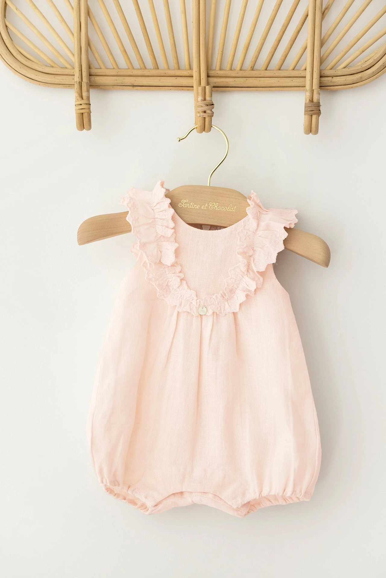 Cette adorable combinaison courte rose pâle en lin formera la tenue parfaite de bébé en cette saison. Ses broderies réalisées à la main ainsi que ses détails volantés sur le haut apporteront la touche finale d’élégance à cette pièce. Réalisée en 100% lin, bébé sera à l’aise au quotidien. On se plaît à l’associer à un joli cardigan de la même collection pour un total look.
