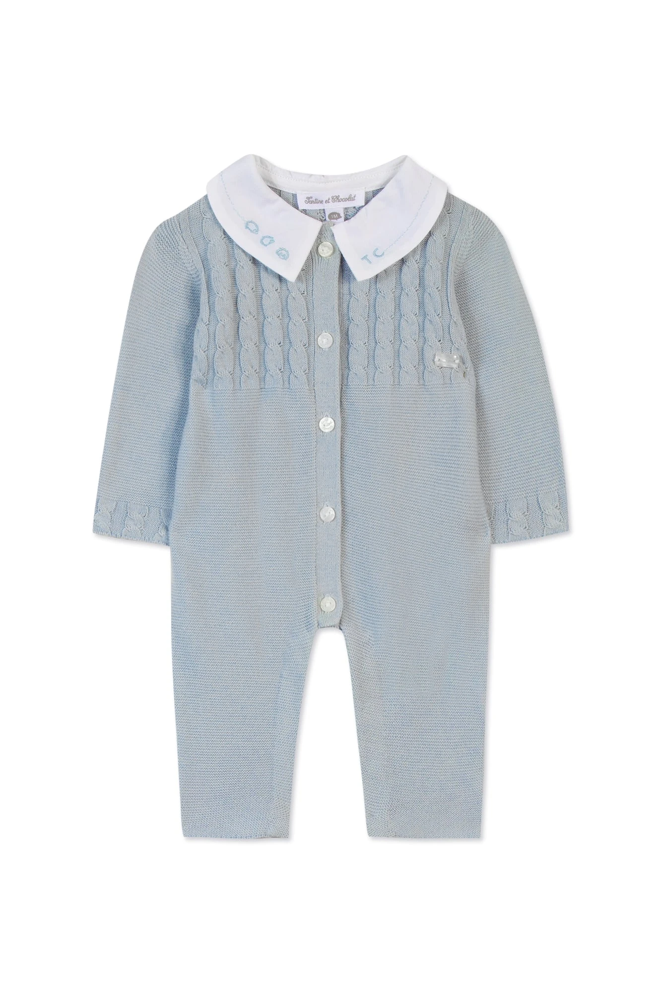 Très confortable grâce à son 100% coton, cette combinaison longue bleue grisée en maille point mousse sera parfaite pour bébé. On aime la sobriété élégante de cette pièce avec ses délicats détails tressés et son adorable col brodé TC. Dans un souci de praticité, la combinaison se ferme à l’avant et au niveau de l’entrejambe par des bouton-pression pour faciliter le change. On aime l’associer à un joli body de la même collection pour un look complet.