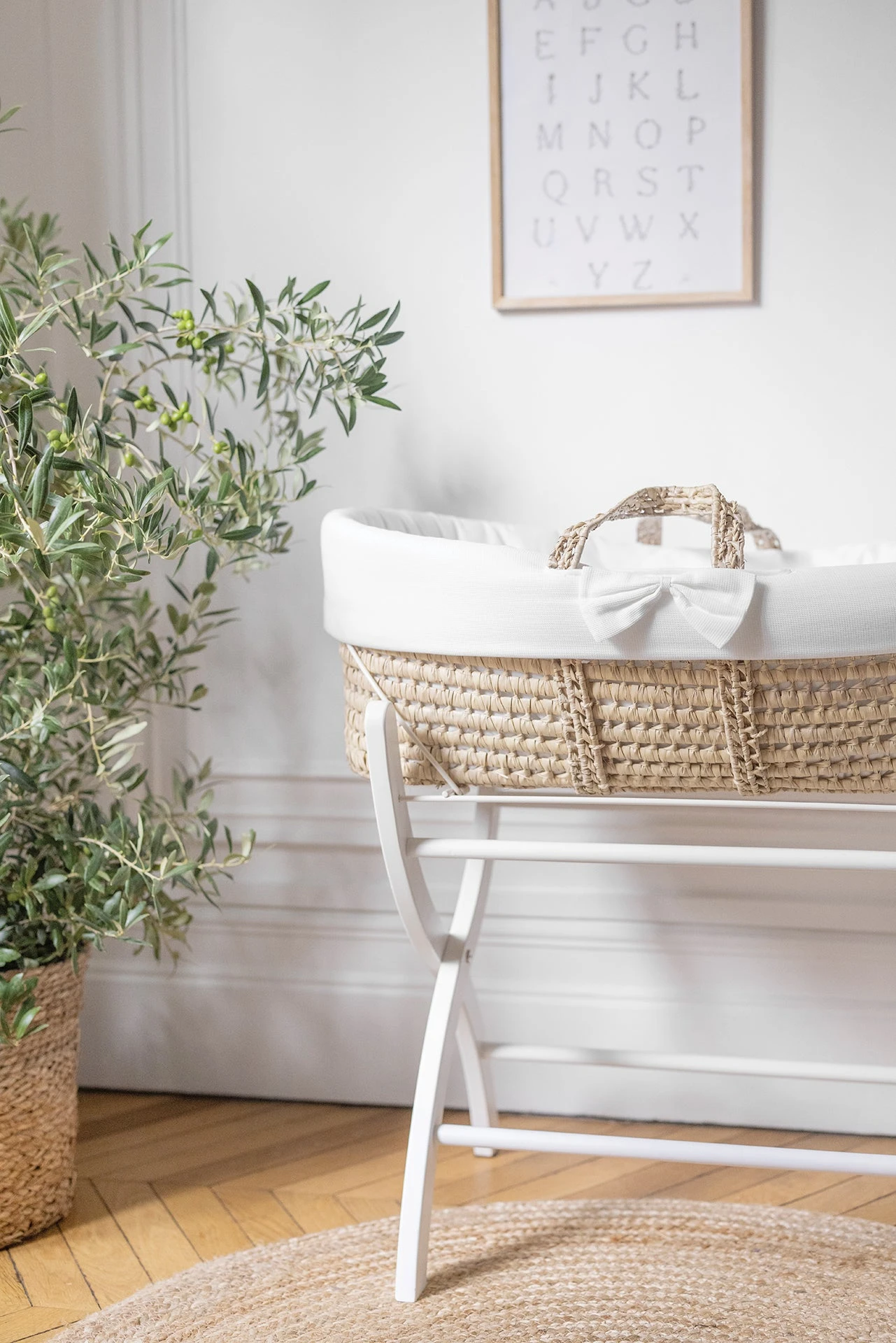 Le couffin en feuilles de palmes tressées à la main comprend un habillage raffiné et un édredon en nid d’abeille. Epuré et élégant, il convient aussi bien aux petites filles qu’aux petits garçons, et sera parfait pour les premières nuits de bébé. Il contient également un matelas en mousse de polyuréthane, respirant, anti-allergénique et sans produit chimique. Le matelas ainsi que l’habillage sont Oeko tex.