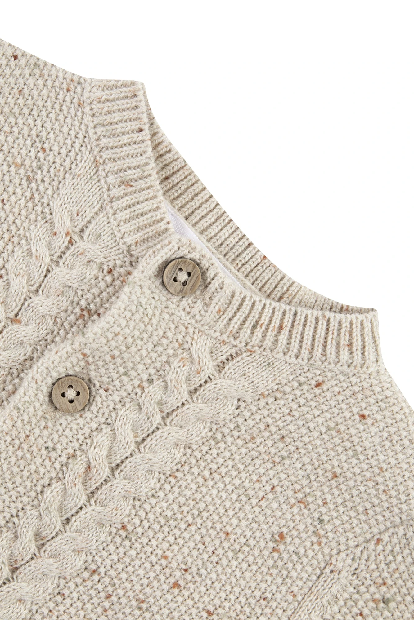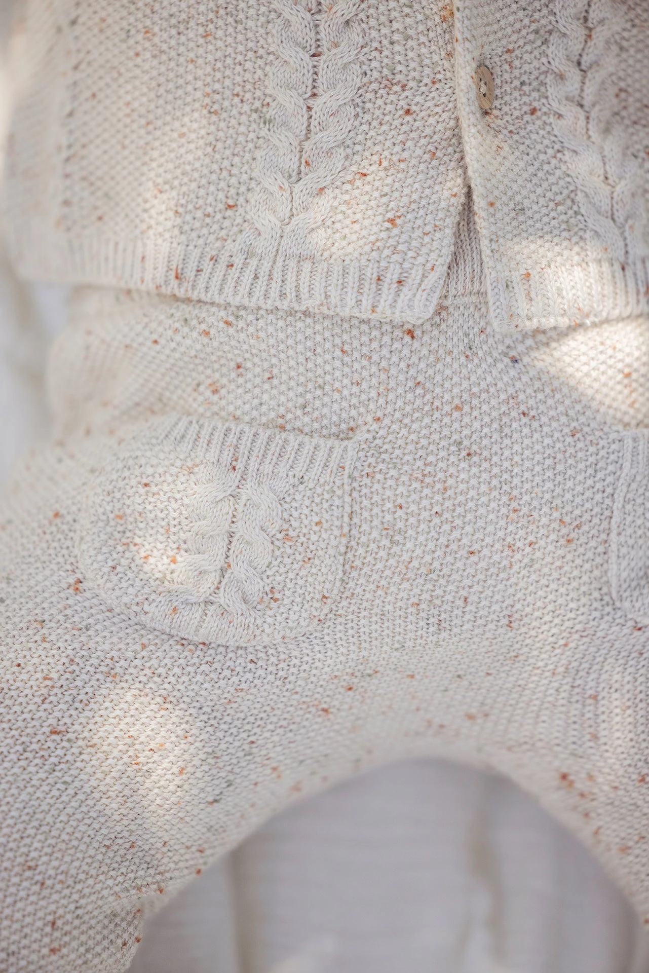 On craque pour cet ensemble long beige en tricot et à fil mouliné composé d’un petit gilet et d’un pantalon. Ces deux pièces offrent douceur et confort à bébé tout en lui apportant une touche supplémentaire d’élégance. Ses détails torsadés ainsi que ses charmantes poches le rendront d’autant plus adorable. La taille élastique et les boutons sur l’avant sont là pour faciliter l’habillage de bébé et assurer une praticité appréciée par les parents. On aime l’associer à un joli body de la même gamme.