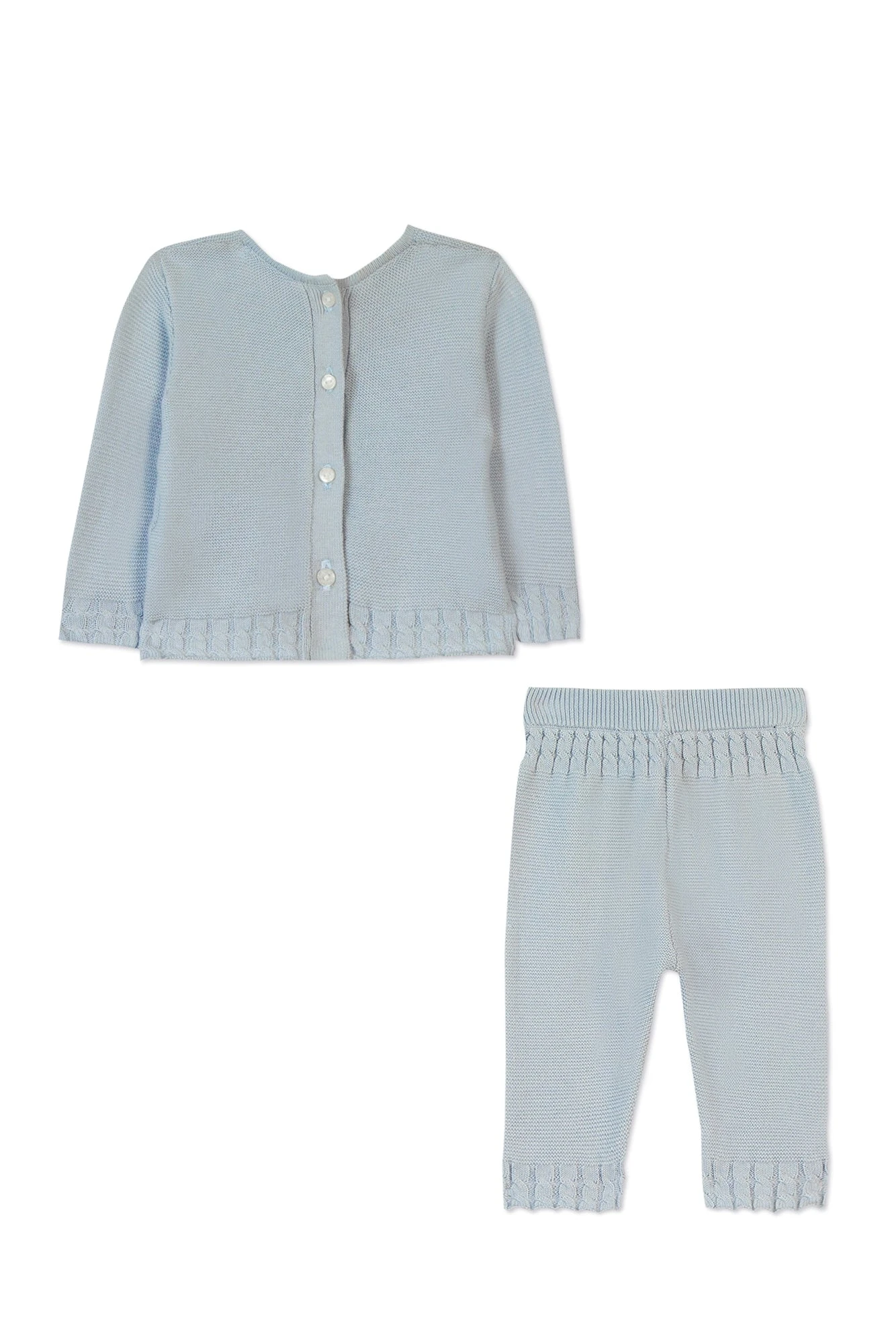 Cet adorable ensemble en maille point mousse bleu grisé sera parfait pour bébé en cette saison. Ses détails tressés ainsi que ses boutons effet nacre apportent une touche supplémentaire d’élégance à la tenue de bébé. Ensemble deux pièces, le change sera alors facilité. On aime l’associer à un joli body pour un total look. signé Tartine et Chocolat.