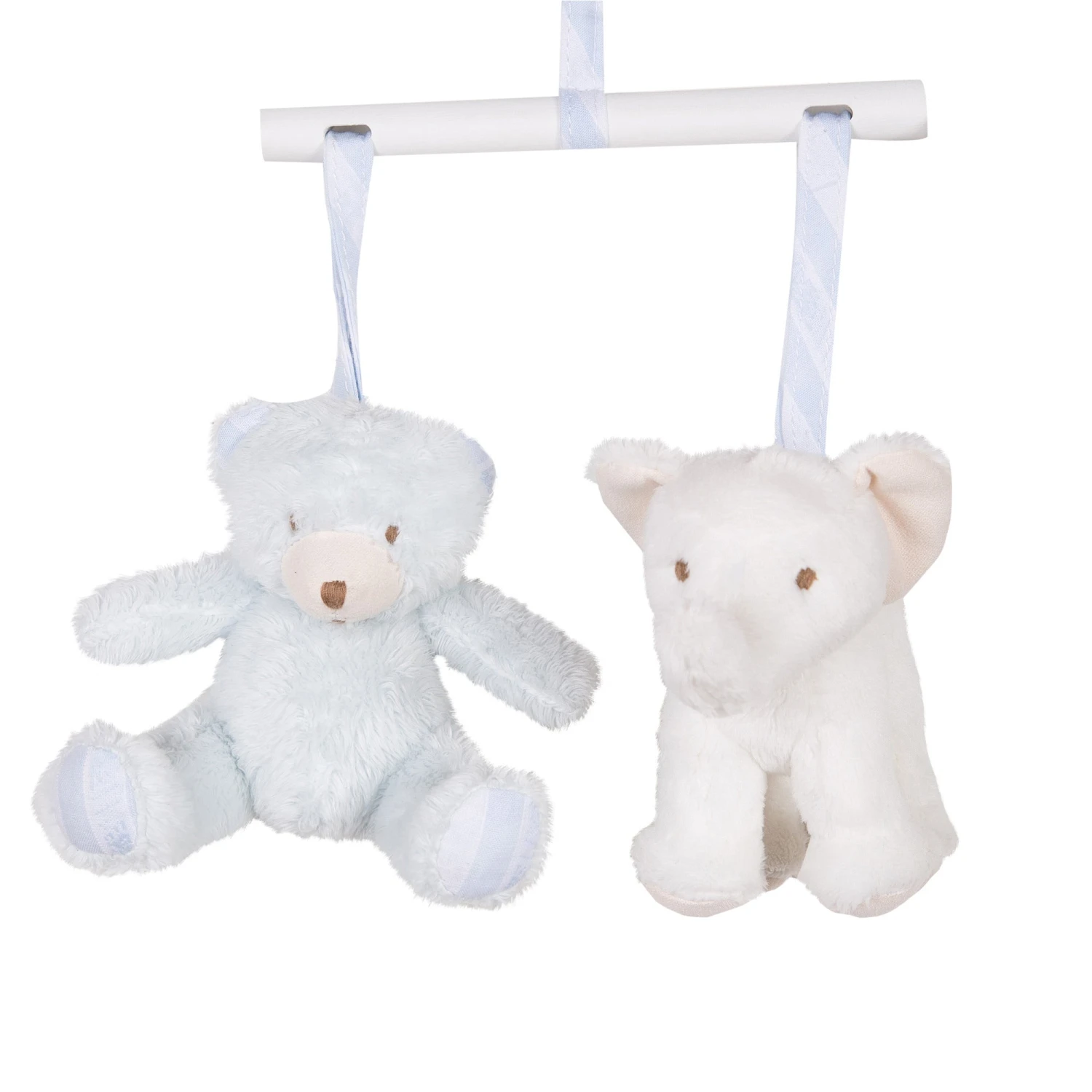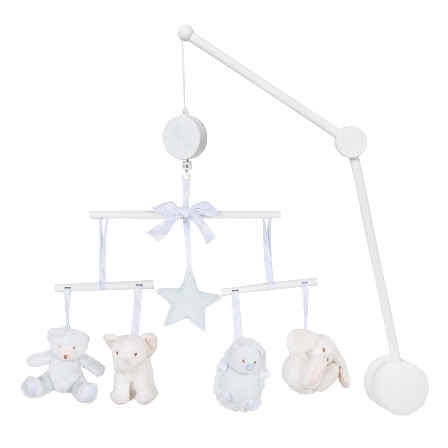 Mobile musical bleu ciel en bois avec fixations pour l’accrocher au lit et quatre bébé peluches. La berceuse jouée est Hush Little Baby Livré avec le mécanisme tournant. Hauteur : 70 cm. ATTENTION : afin d’éviter tout risque de blessure suite à un enchevêtrement, arrêter le jouet dès que l’enfant tente de se mettre à quatre pattes ou de ramper. Age conseillé : 0-5 mois. T30603H-41