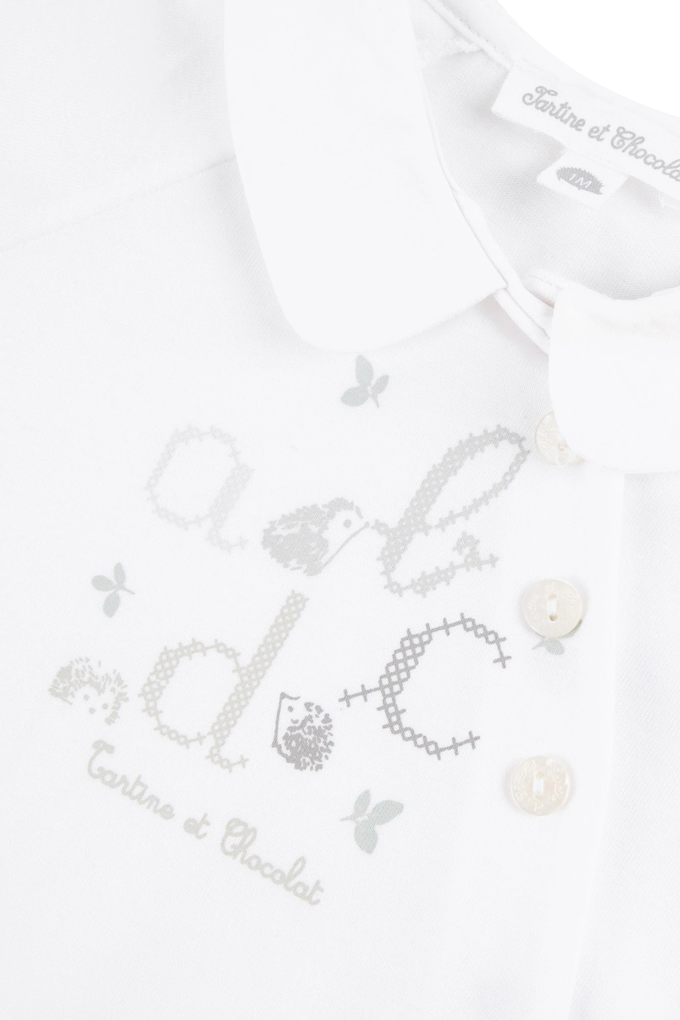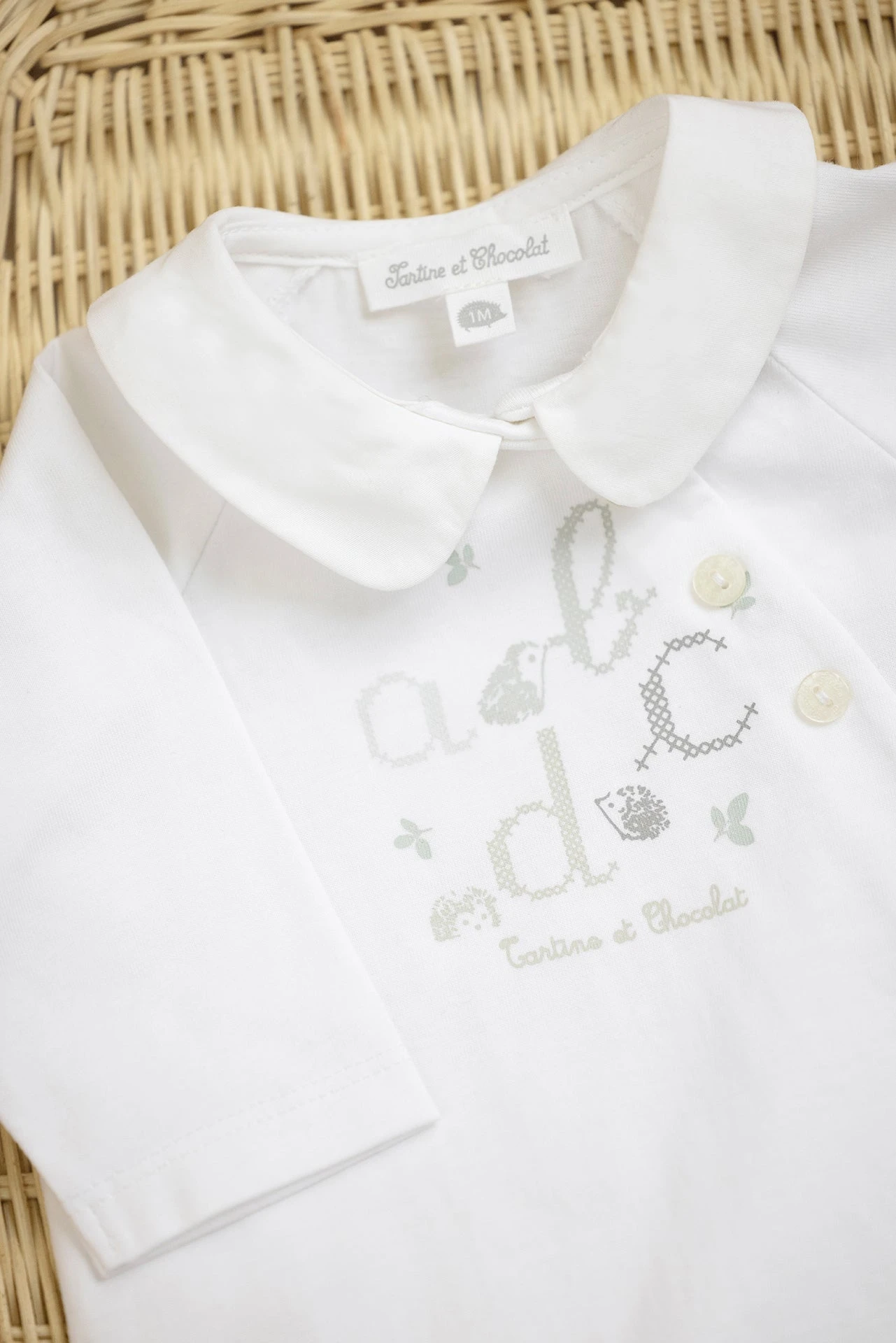 On craque pour cet adorable pyjama blanc 100% coton au col claudine. Ce joli pyjama est orné d’une sérigraphie abécédaire à l’avant ajoutant une touche de douceur et de tendresse. Bébé se sentira accompagné et réconforté lors de ses nuits. Doté d’une ouverture latérale et de boutons-pression, le change sera d’autant plus facilité. On aime l’associer à un joli body de la même collection.