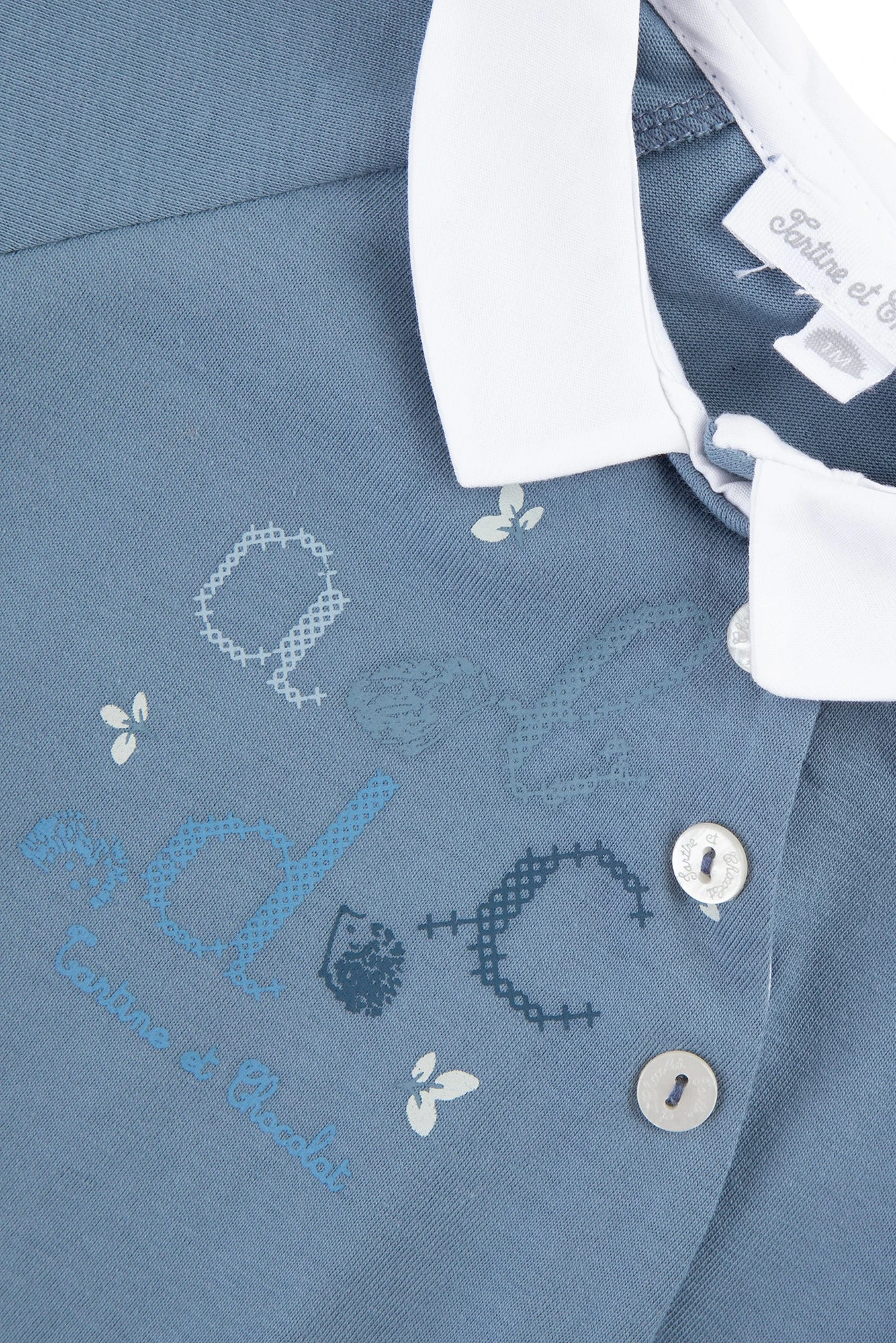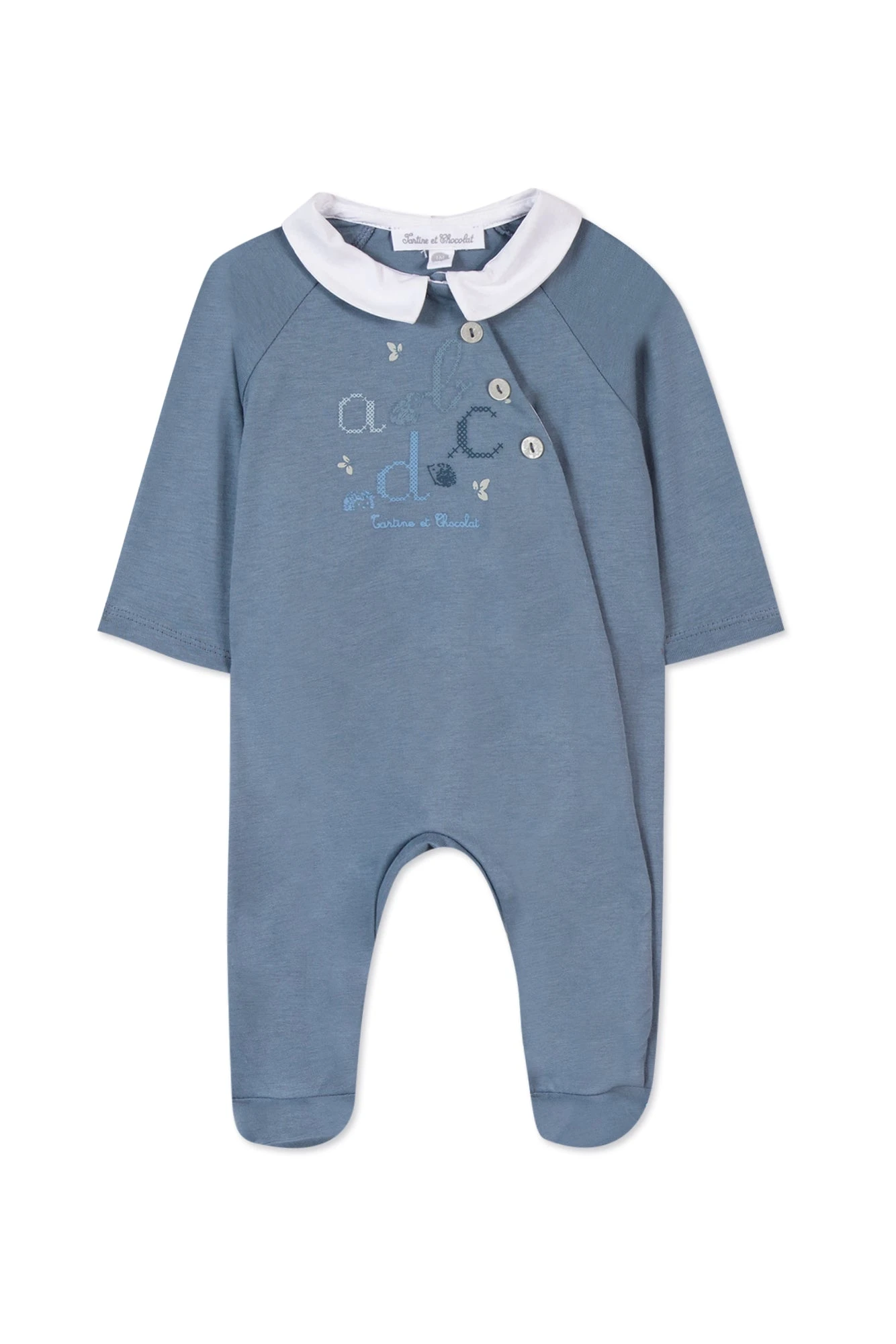 On craque pour cet adorable pyjama bleu nuage 100% coton au col pointu. Ce joli pyjama est orné d’une sérigraphie abécédaire à l’avant ajoutant une touche de douceur et de tendresse. Bébé se sentira accompagné et réconforté lors de ses nuits. Doté d’une ouverture latérale et de bouton-pression, le change sera d’autant plus facilité. On aime l’associer à un joli body de la même collection.