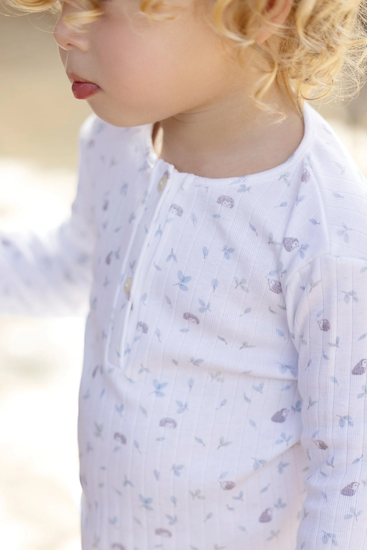 On craque pour cet adorable pyjama deux pièces blanc 100% coton au col rond. Ce joli pyjama aux imprimés feuillage hérissons ajoute une touche de douceur et de tendresse parfaite pour la saison. Bébé se sentira accompagné et réconforté lors de ses nuits. Doté d’une ouverture à bouton-pression à l’avant et au niveau de l’entrejambe, le change sera d’autant plus facilité. On aime l’associer à un joli body de la même collection.