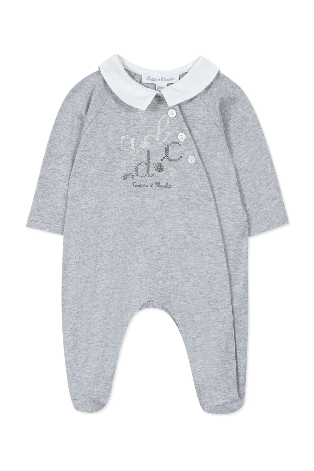 On craque pour cet adorable pyjama gris clair 100% coton au col pointu. Ce joli pyjama est orné d’une sérigraphie abécédaire à l’avant ajoutant une touche de douceur et de tendresse. Bébé se sentira accompagné et réconforté lors de ses nuits. Doté d’une ouverture latérale et de bouton-pression, le change sera d’autant plus facilité. On aime l’associer à un joli body de la même collection.
