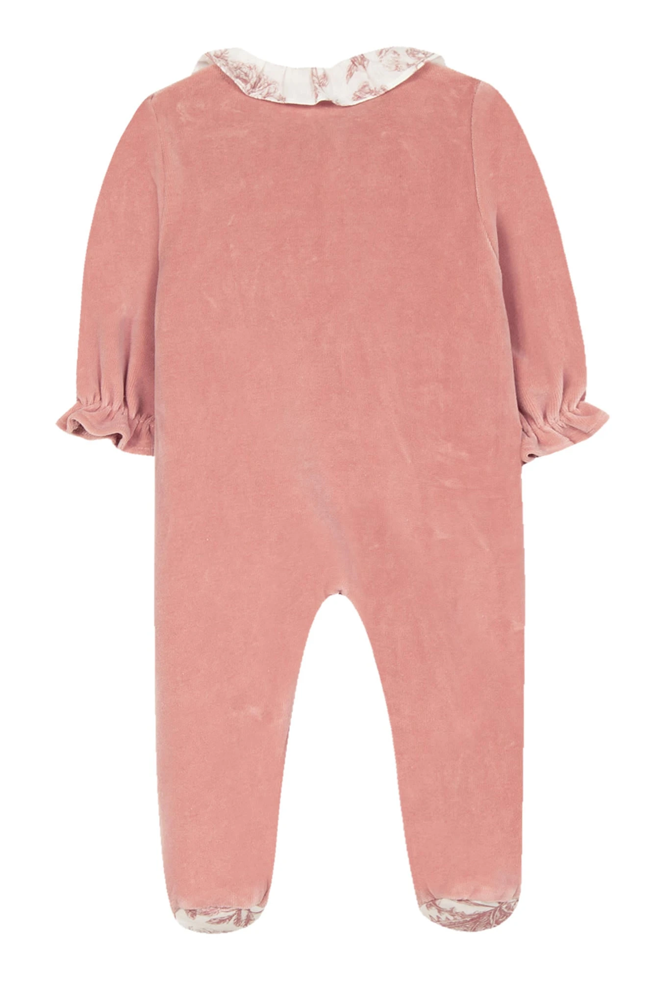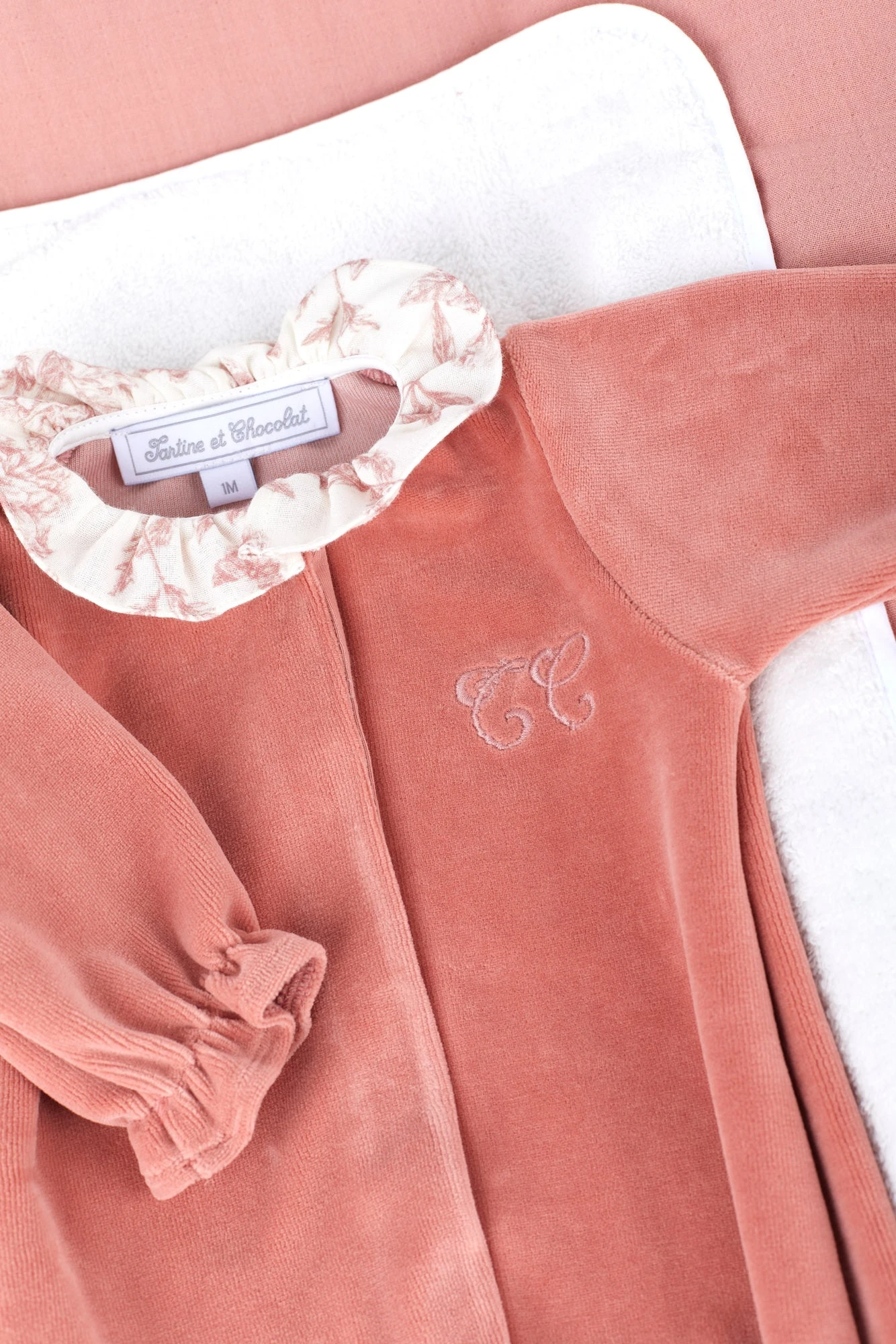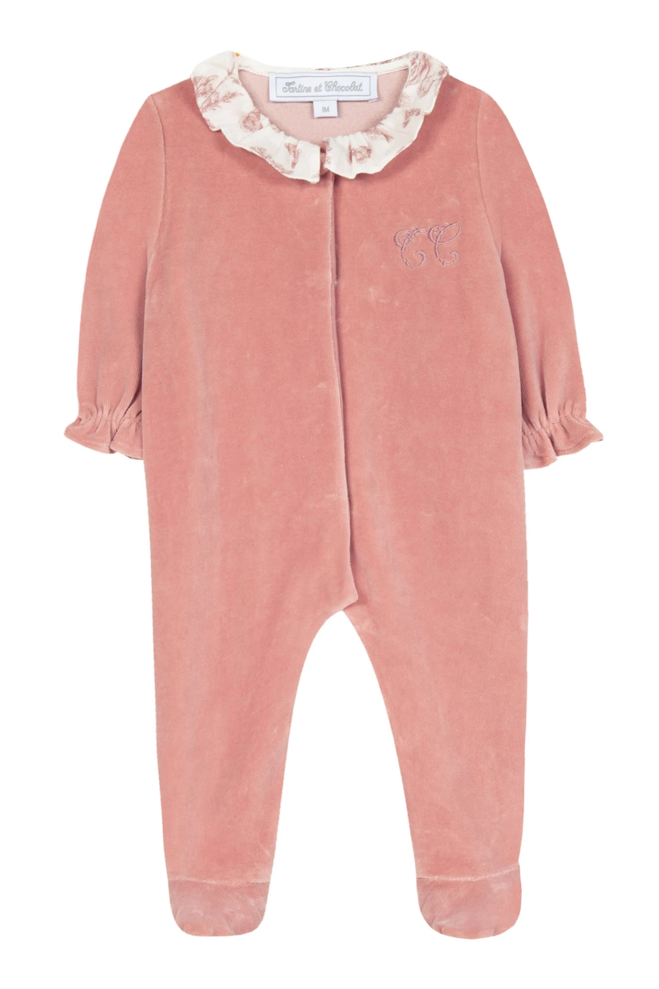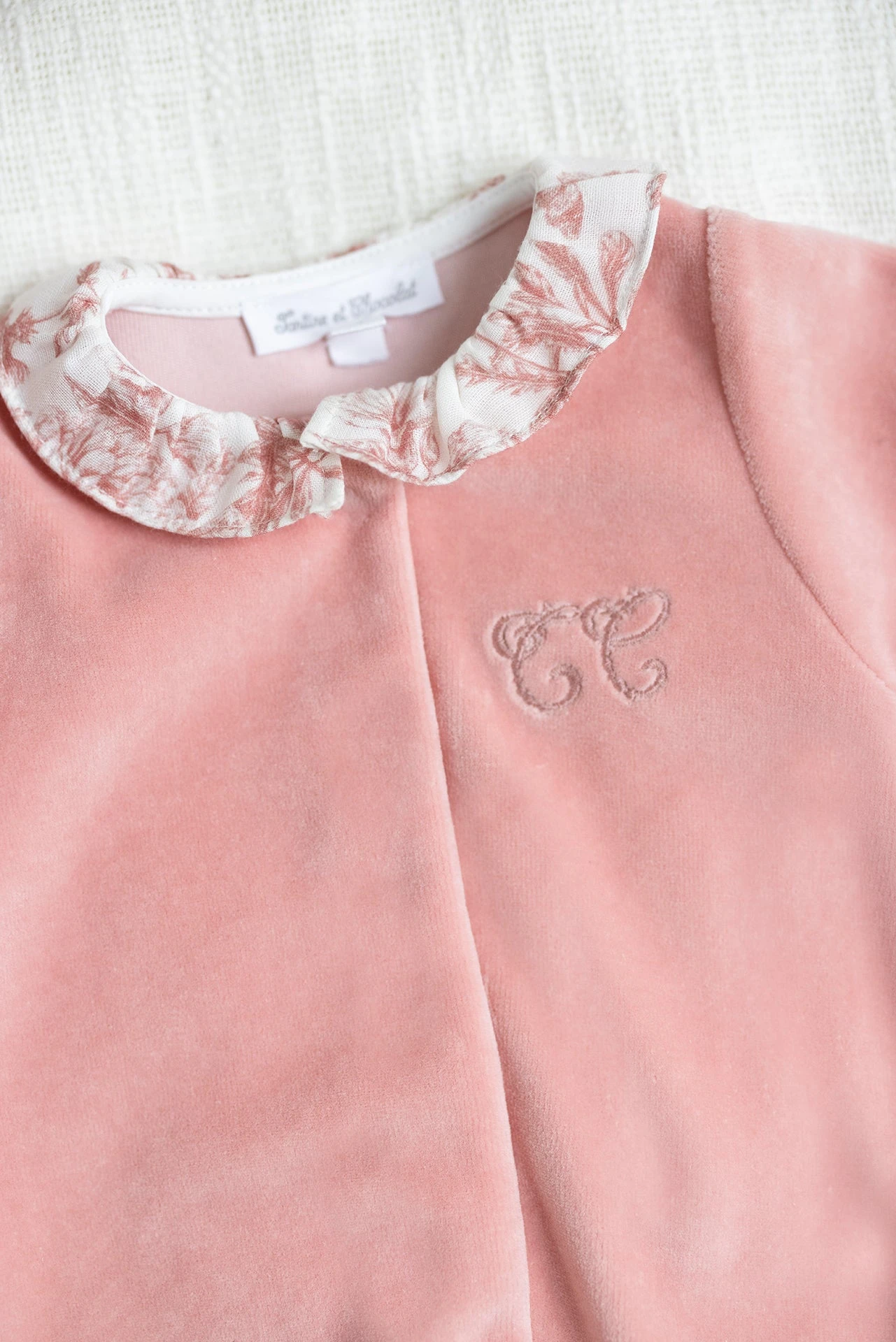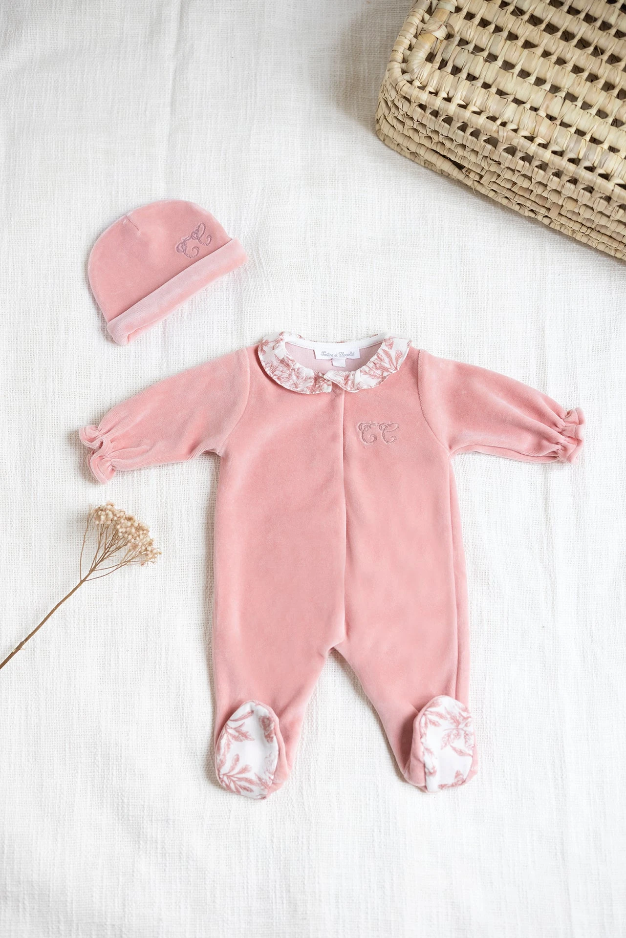 Pyjama en velours avec ouverture par boutons pressions sur le devant. On craque pour son col volanté à l’imprimé inspiration Toile de Jouy dessiné par Tartine et Chocolat et le rappel sous les pieds. Bonnet vendu séparément.