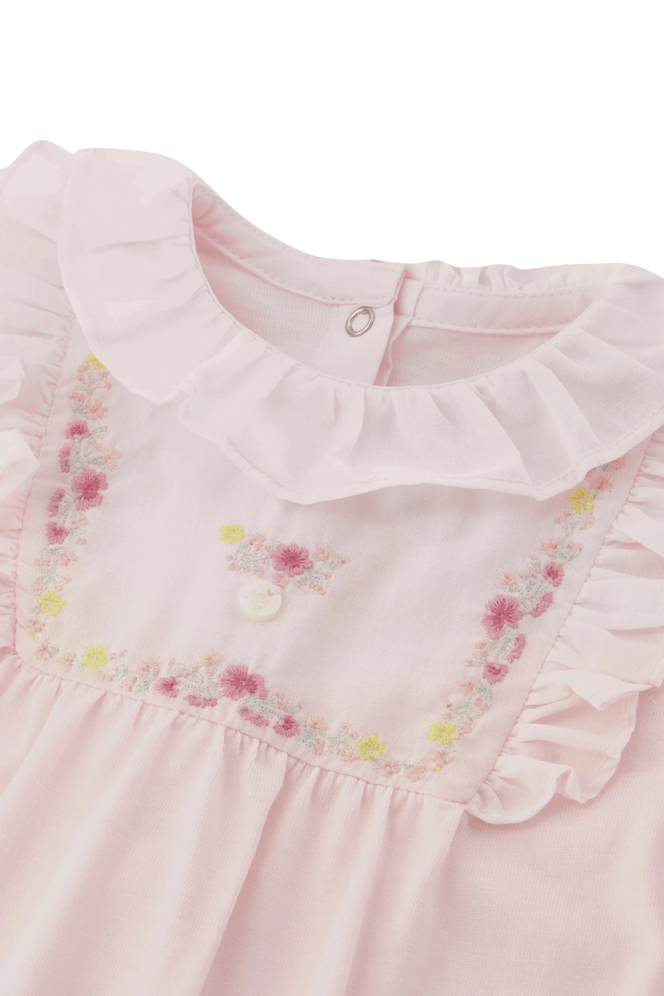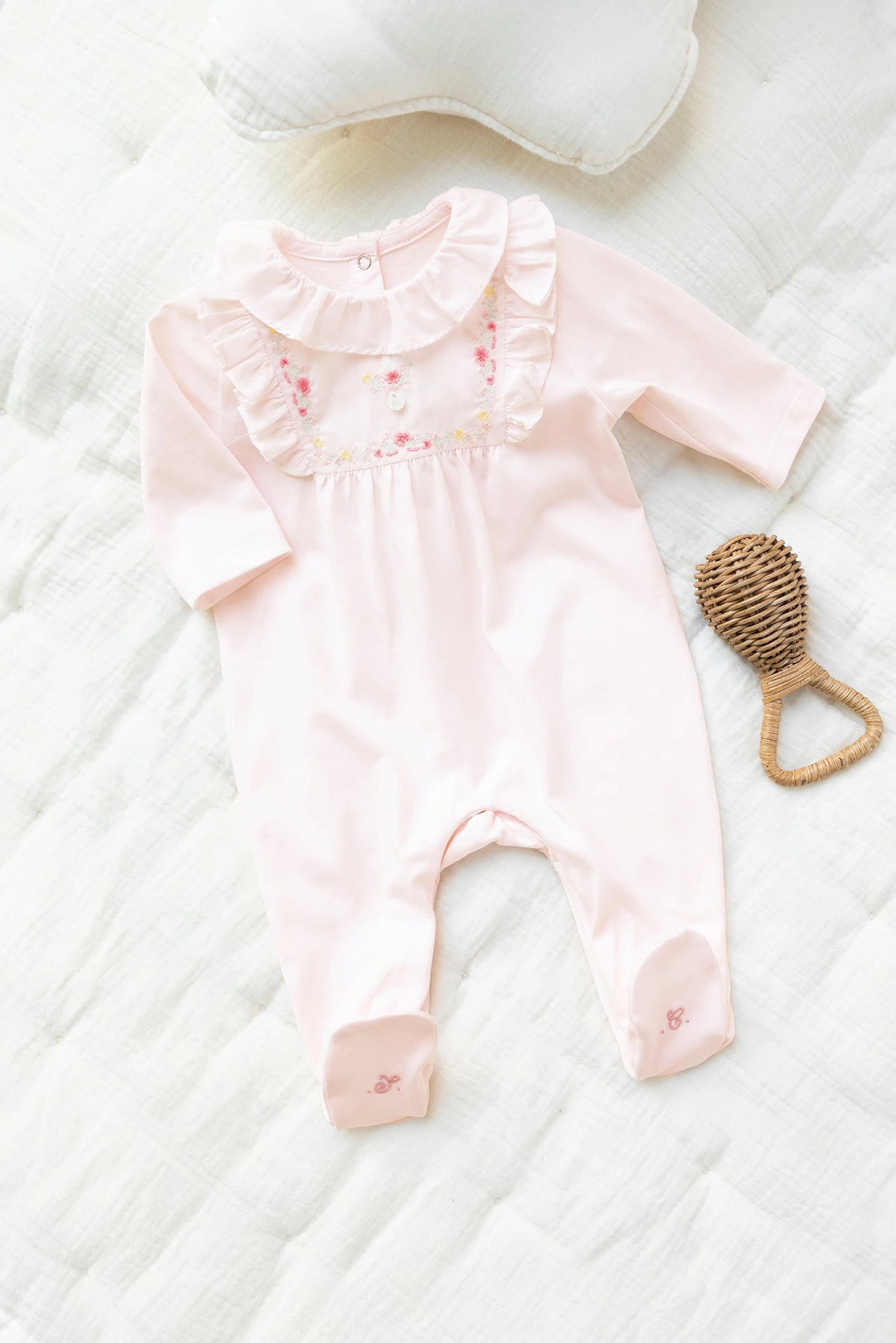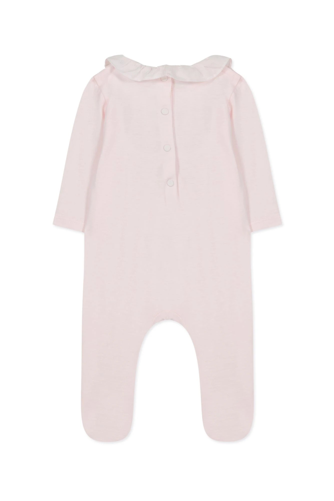 On craque sur cet adorable pyjama rose pâle qui sera parfait pour la tenue de bébé en cette saison. Son col plastron aux broderies représentant des jolies roses apporte une touche supplémentaire d’élégance à cette pièce. Réalisée en 100% coton, bébé sera blottie dans une bulle de douceur tout au long de la journée et de la nuit. On se plaît à l’associer à un joli body de la même collection pour un total look.
