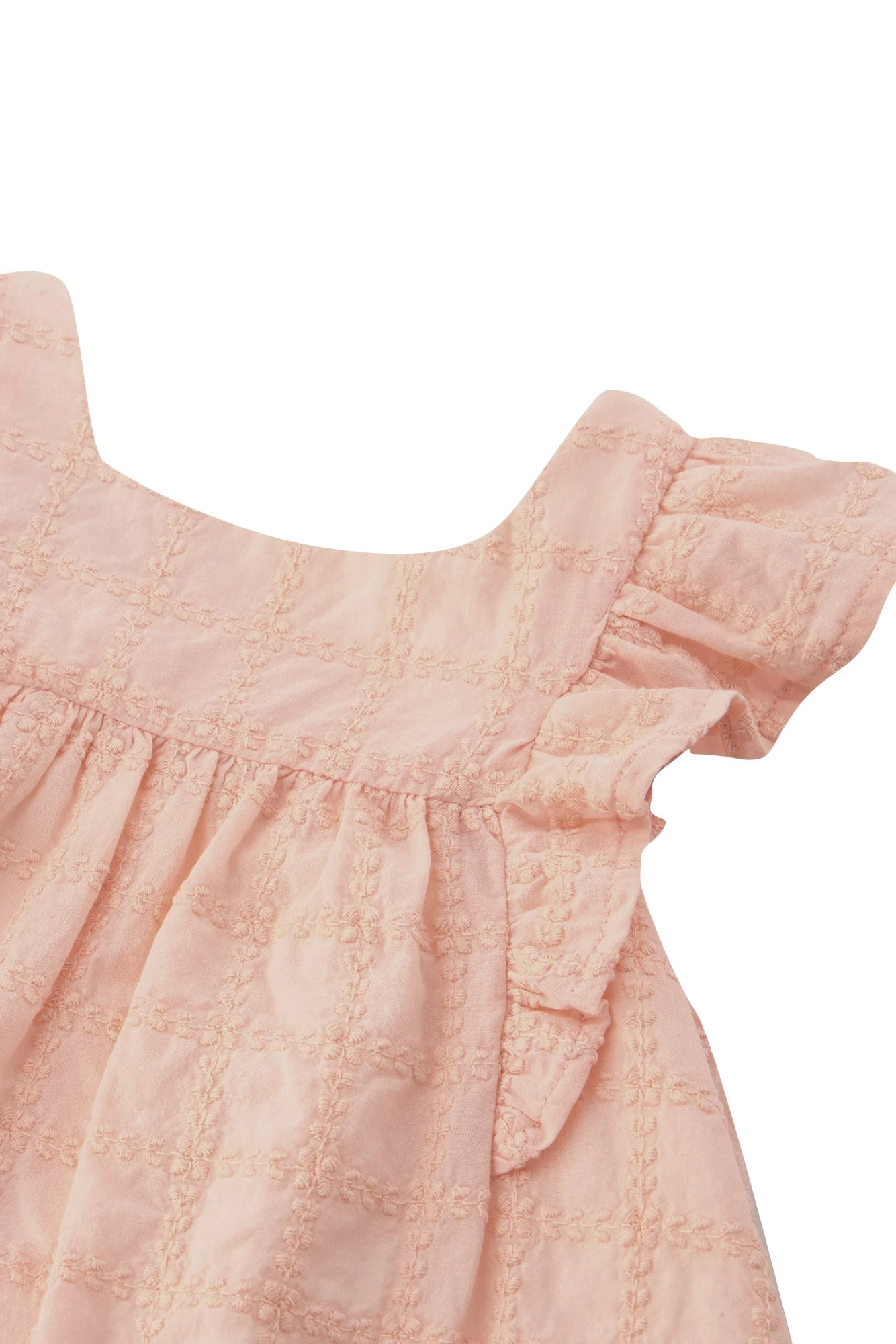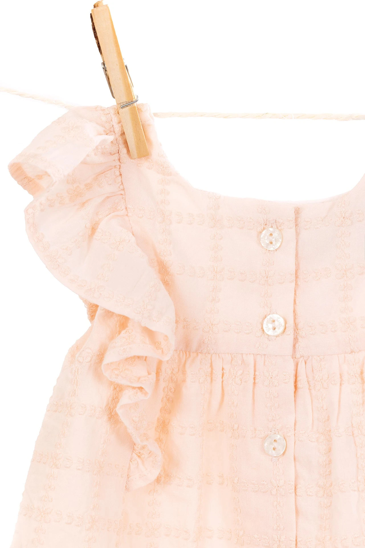 Prête pour les grandes occasions avec cette robe aussi élégante qu’agréable à porter. Confectionnée dans des matières douces, cette belle robe rose pâle à carreaux ton sur ton offrira confort et raffinement à votre petite fille. On adore les volants au niveau des emmanchures qui viennent parfaire la coupe de cette jolie robe. On l’associe avec une barrette de la même collection pour un total look irrésistible.