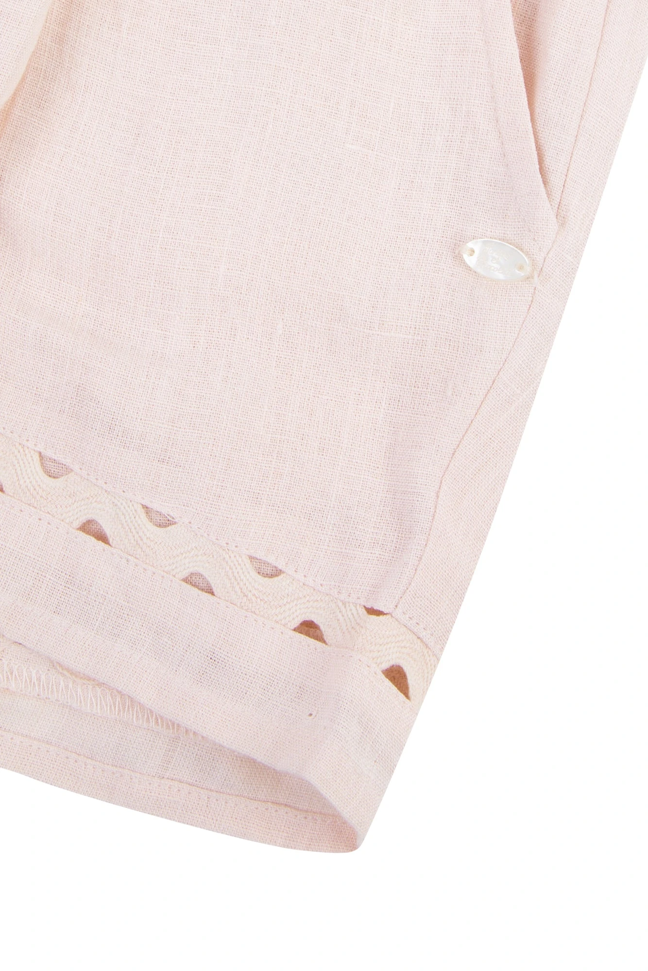 Ce short léger et confortable en 100% lin est une pièce must-have de la saison estivale. Son coloris rose pâle et ses détails croquet au niveau du bas apportent de la douceur aux looks des petites filles. On aime sa taille marquée ainsi que la signature Tartine et Chocolat. Pour un total look, on aime le porter avec une jolie blouse de la même collection.