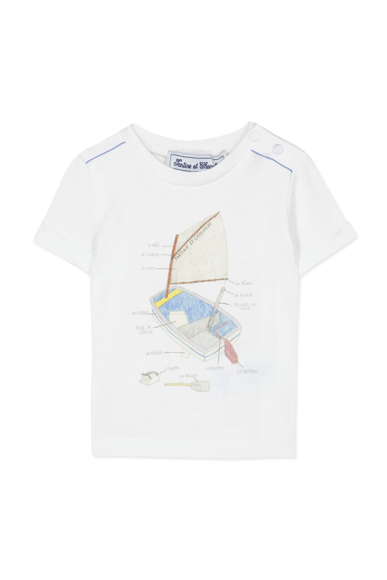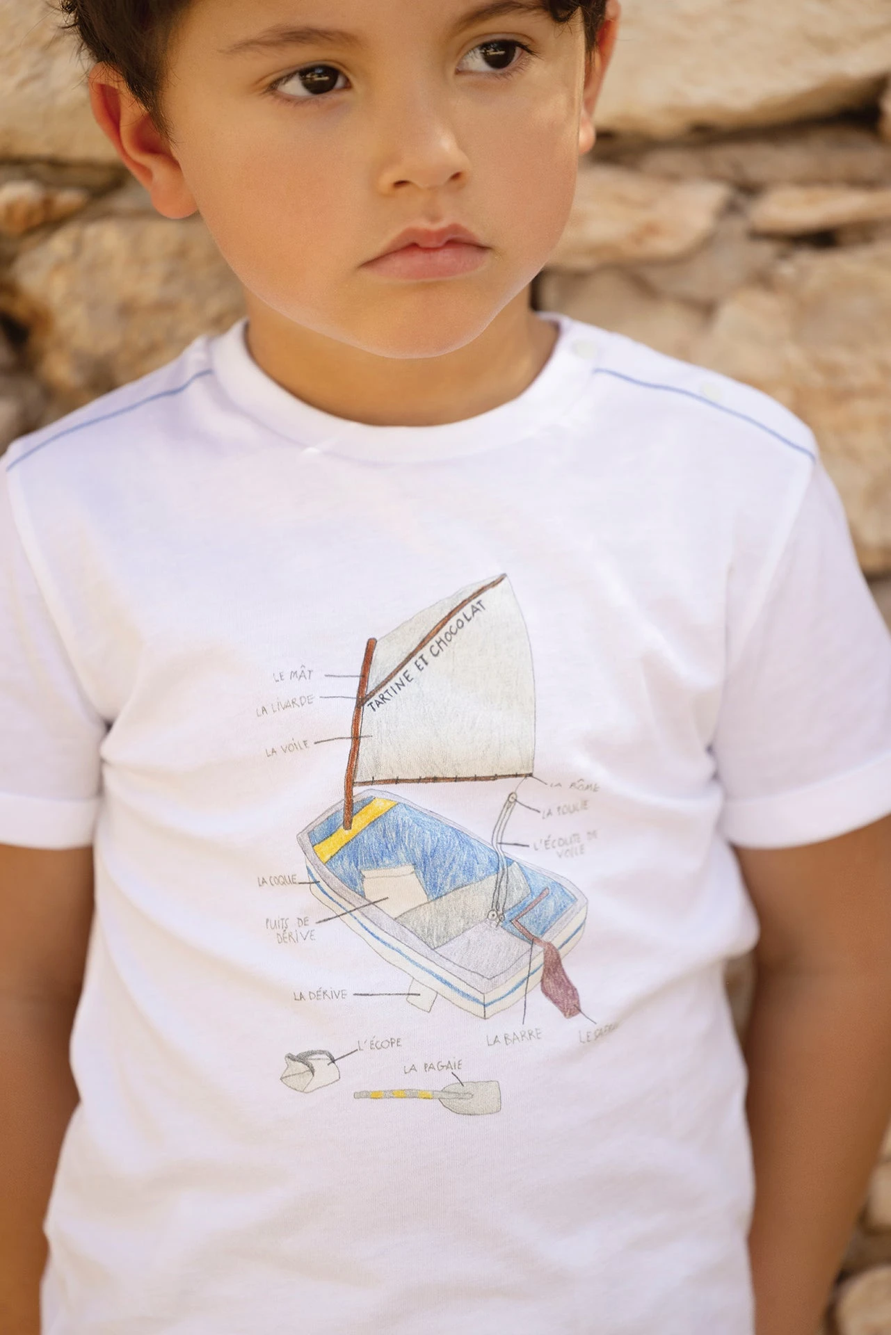 On craque pour cet adorable t-shirt blanc et son illustration dépaysante de bateau azur, parfait pour encourager nos marins préférés. Aussi confortable qu’élégant grâce à sa matière en 100% coton, ce t-shirt est un incontournable du dressing de bébé. Le t-shirt est doté d’une ouverture latérale avec des boutons pression pour faciliter l’habillage. On se plaît à l’accorder à un short de la même collection.