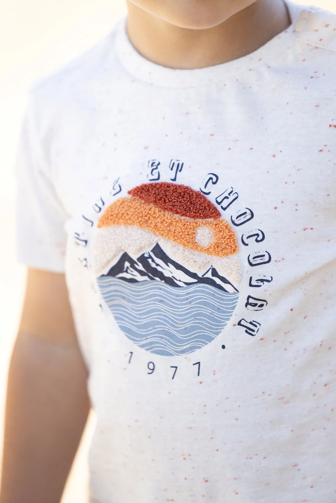 On craque pour cet adorable t-shirt effet moucheté et son illustration dépaysante du soleil couchant à motif bouclette, parfait pour encourager nos aventuriers préférés. Aussi confortable qu’élégant grâce à sa matière en coton et à sa signature Tartine et Chocolat à l’avant, ce t-shirt est un incontournable du dressing de bébé. Le t-shirt est doté d’une ouverture latérale avec des boutons pression pour faciliter l’habillage. On se plaît à l’accorder à un short de la même collection.