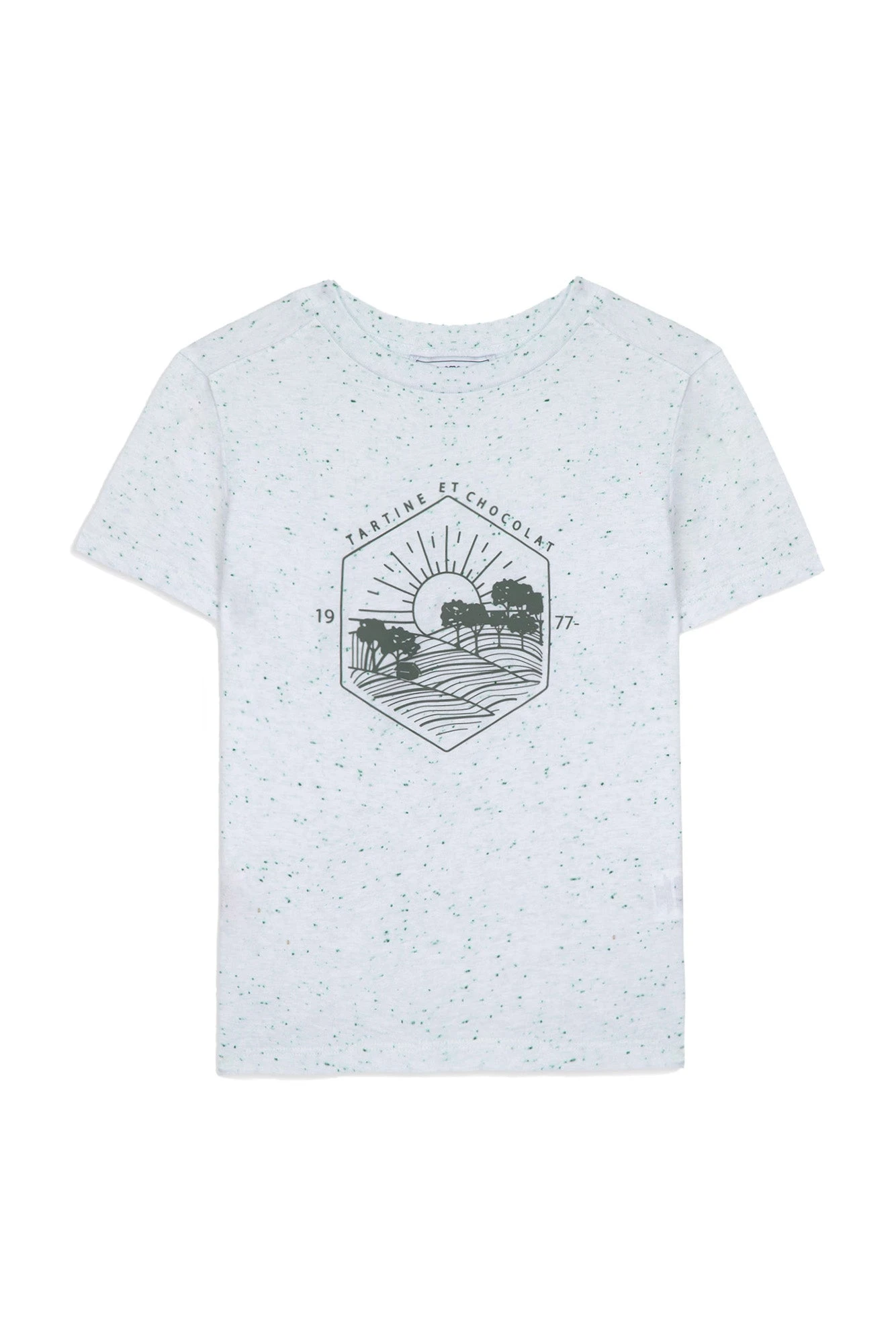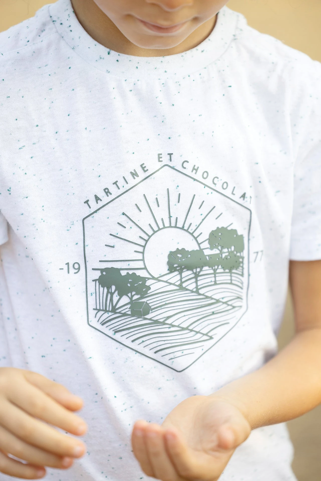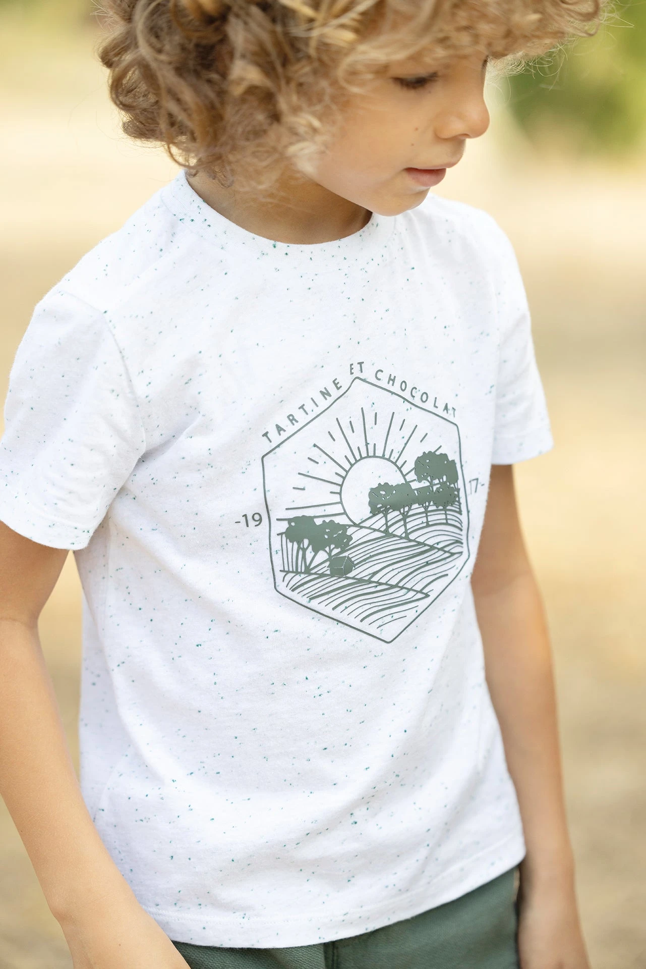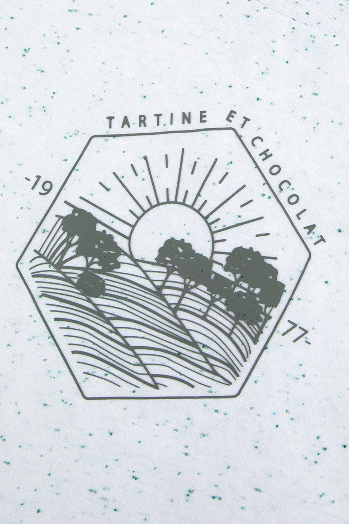 On craque pour cet adorable t-shirt blanc et son illustration champ, parfait pour encourager nos passionnés de nature. Aussi confortable qu’élégant grâce à sa matière en coton et à sa signature Tartine et Chocolat à l’avant, ce t-shirt est un incontournable du dressing du petit garçon. On se plaît à l’accorder à un short de la même collection.