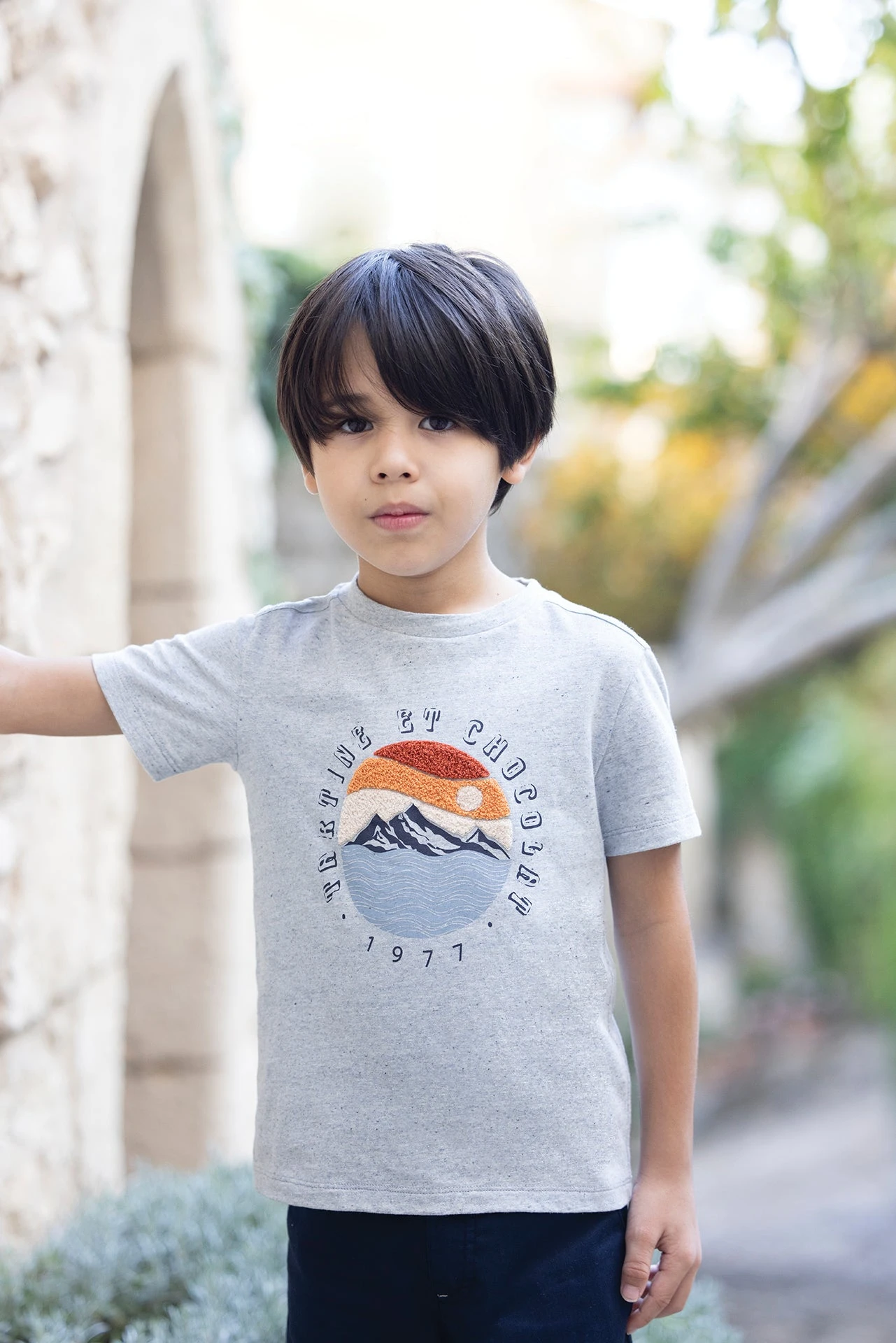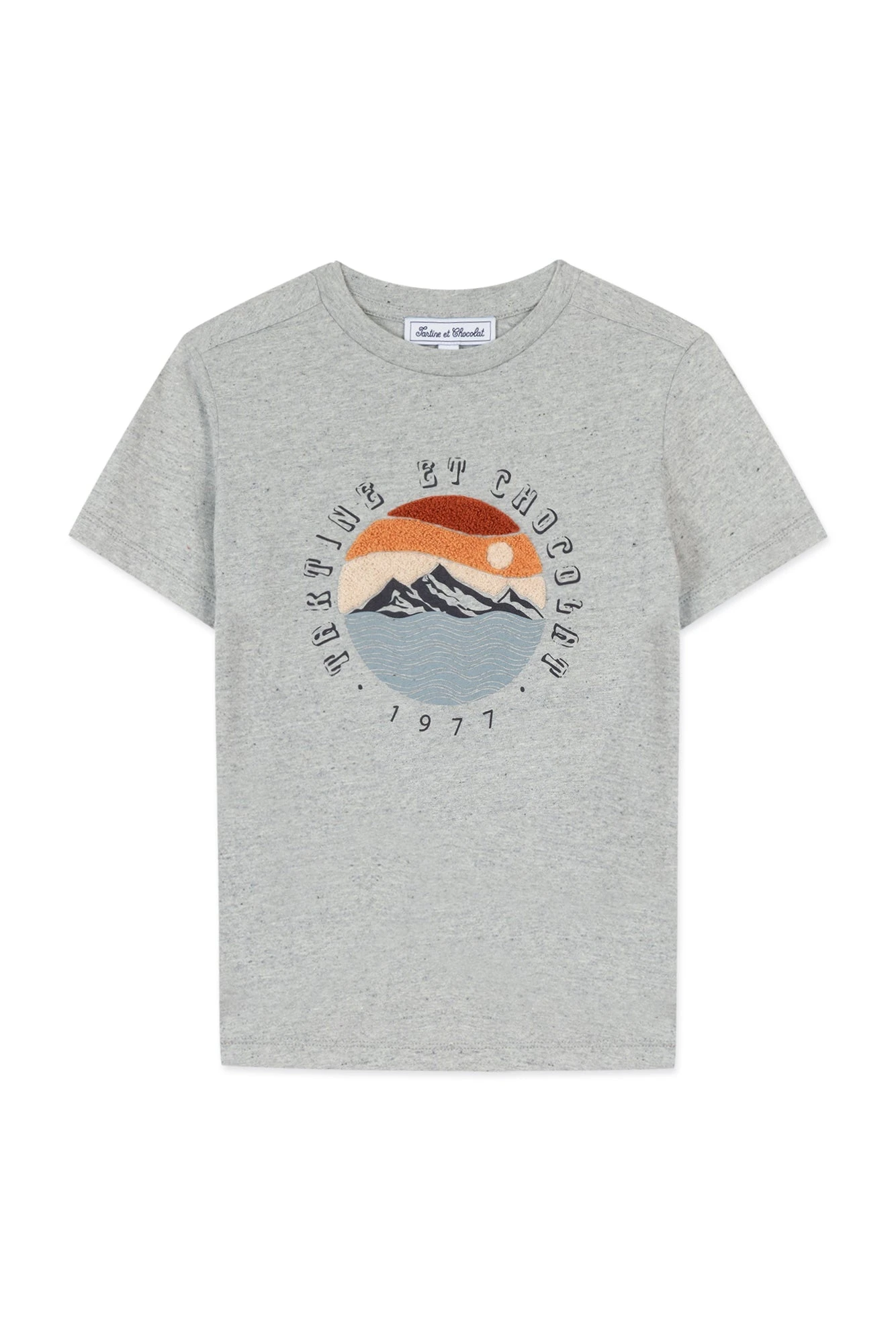 On craque pour cet adorable t-shirt gris chinĂ© et son illustration soleil couchant en relief, parfait pour encourager nos passionnĂ©s de l’aventure. Aussi confortable qu’Ă©lĂ©gant grâce Ă sa matière en coton et Ă sa signature Tartine et Chocolat Ă l’avant, ce t-shirt est un incontournable du dressing du petit garçon. On se plaĂ®t Ă l’accorder Ă un short de la mĂŞme collection.