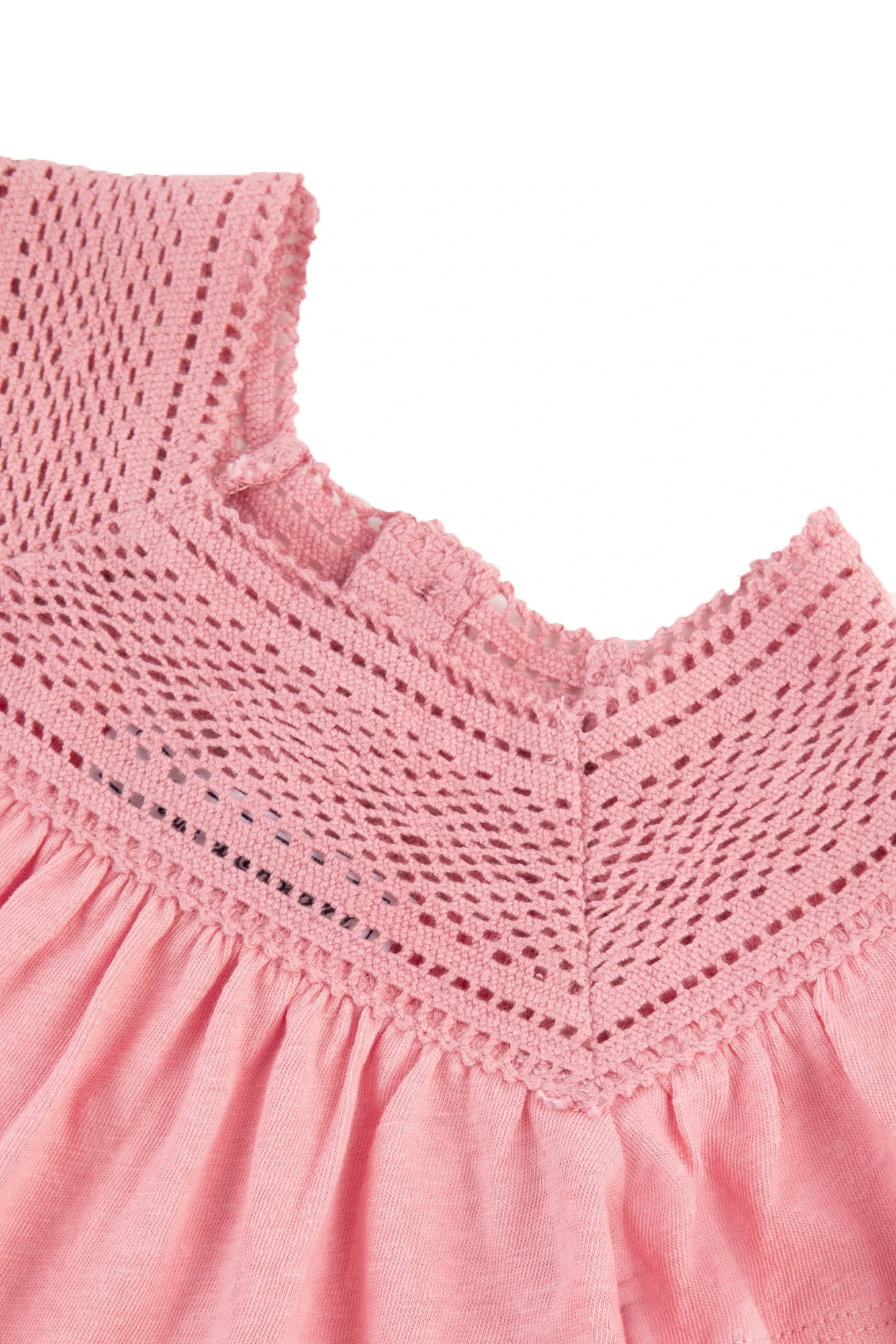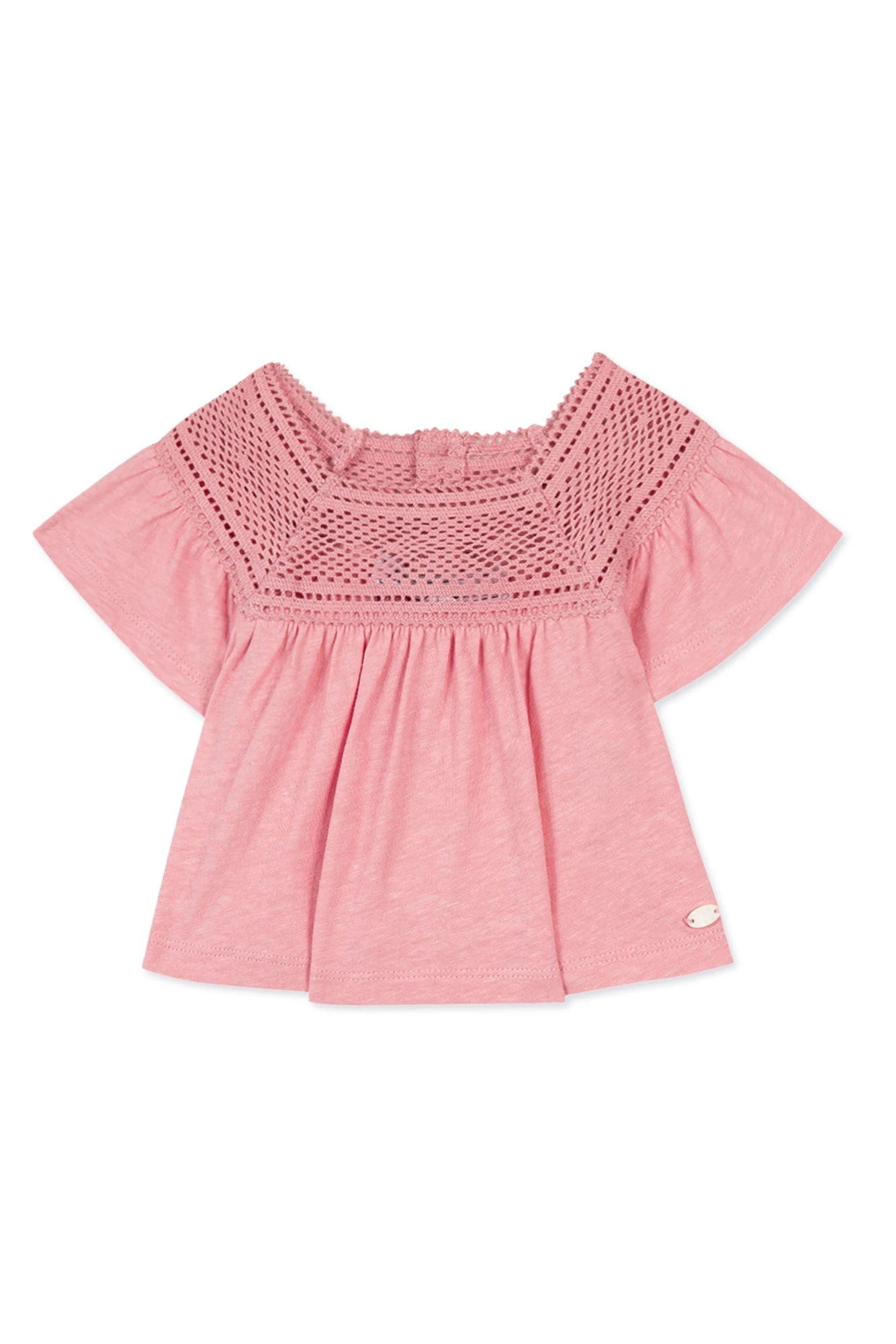 Souple et délicat, ce joli t-shirt rose en crochet coton apporte fraicheur et élégance dans la garde-robe des petites filles. Ses matières douces notamment le coton et le lin ainsi que sa finition volantée en font une pièce idéale pour un été chic. Parfait à associer avec un joli short de la sélection pour un total look.