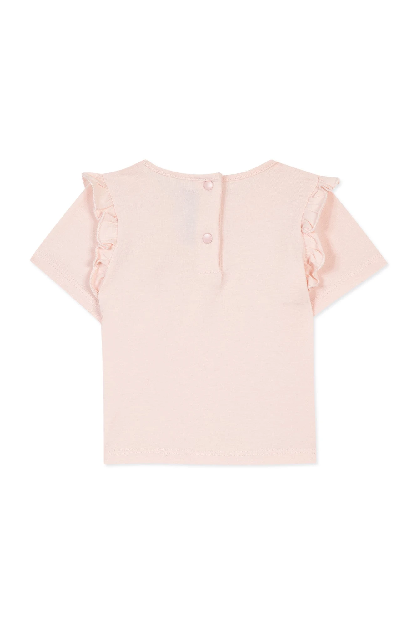 Souple et délicat, ce joli t-shirt rose pâle aux manches volantées apporte fraicheur et élégance dans la garde-robe des petites filles. On craque sur son illustration lapin aux détails liberty ainsi que sur sa signature Tartine et Chocolat. Constituée essentiellement de coton, cette pièce sera idéale pour un été chic. Parfait à associer avec un joli short de la sélection pour un total look.