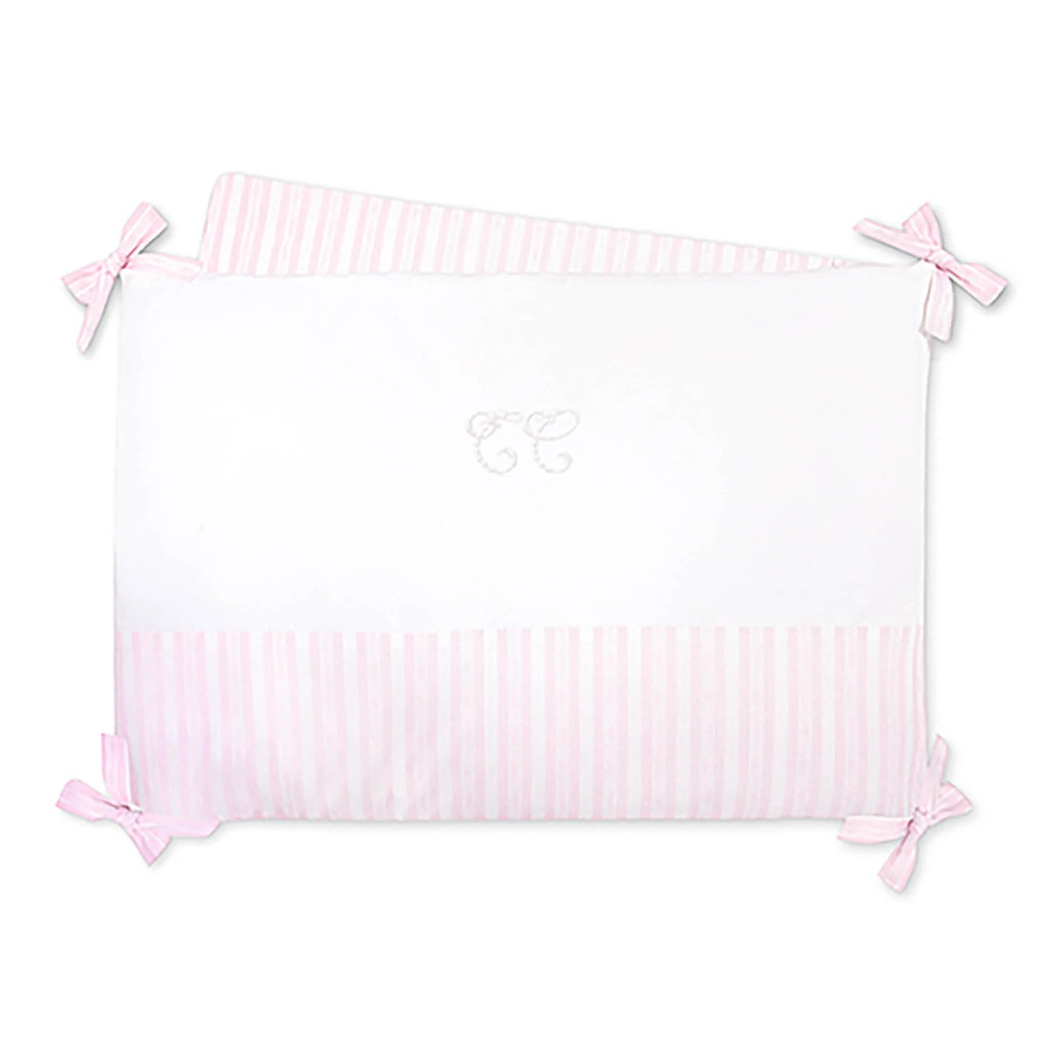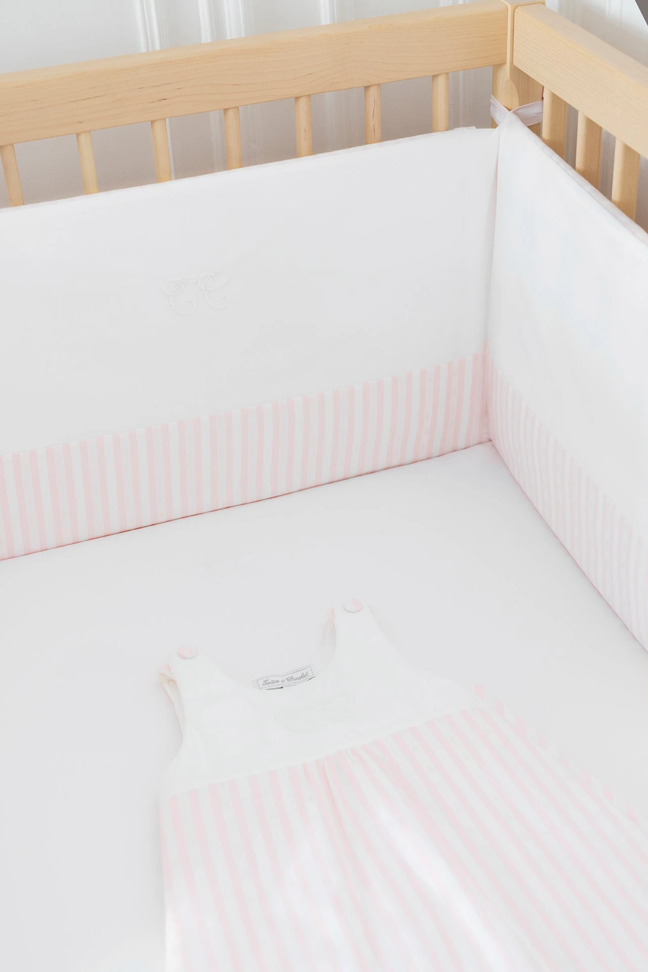 Tour de lit adaptable Garda rose pâle, en popeline de coton piqué et fil à fil. Se fixe aux barreaux du lit par de petits noeuds. Dimensions : 40 x 175 cm. Compatible pour lits de 60 x 120 cm, ou lits de 70 x 140 cm. La ligne Garda : une ligne emblématique qui symbolise tout l’esprit Tartine et Chocolat. Des rayures chics et élégantes, associées aux couleurs pastel de l’enfance, un écusson finement brodé, des tissus doux et tendres. Fabriqué au Portugal. TP73021-41
